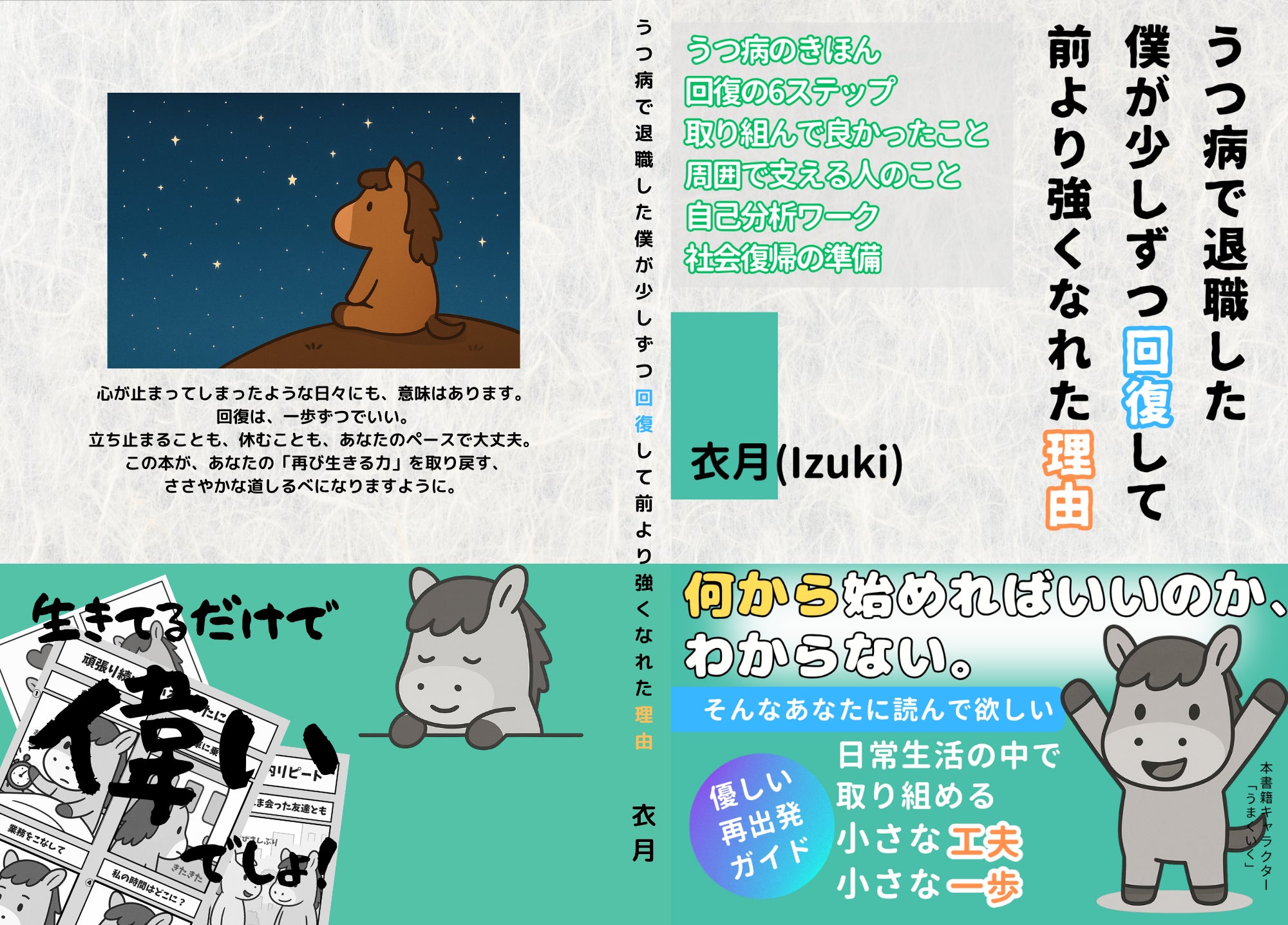 2025/06/17 10:54こんにちは、衣月です。今日は、Kindle書籍に関する大切なお知らせです。このたび、私が執筆したエッセイの書籍タイトルを変更いたしました。 旧タイトル『メンタル不調を進化のチャンスに変える』新タイトル『うつ病で退職した僕が少しずつ回復して前より強くなれた理由』タイトルを変えた理由正直に言えば、「進化のチャンス」という前のタイトルには、私なりに深い思いを込めていました。うつ病や休職を経験して、何もかもが終わったように感じたあの日。でも、その日々を経てようやく見つけられた「生き方のヒント」や「自分との付き合い方」。そうした再出発の過程は、まさに“進化”でした。ただ──読者の方や支援してくださった方々の声を聞いて、もっと等身大で、ストレートに想いが伝わる言葉に変えたいと思ったのです。「うつ病で退職した僕」が伝えたかったことこの本では、私自身がうつ症状で2度の休職を経て、引きこもり生活を過ごしながら、少しずつ「自分を整える力」を育てていった過程をリアルに綴っています。どう休んでいいか分からなかった日罪悪感でベッドから出られなかった日小さな光が見えたと感じた日それぞれのフェーズで「してよかったこと」「やらなくてよかったこと」、そして“自分と向き合うためのヒント”を、6つの再出発ステップとしてまとめました。タイトルは変わっても、想いは変わりません新しいタイトルに込めたのは、「もう一度、前より自分らしく歩き出せた理由を、今つらいあなたに届けたい」という気持ちです。どん底からでも人は変われる。完璧じゃなくていい。少しずつでも回復していける。そんな想いを、これからも発信していきます。書籍のご案内とリンク先行版のKindle電子版、紙書籍版発売中!Amazonで発売がスタートしました。もしご興味を持っていただけたら、ぜひ下記のリンクよりご覧ください。書籍ページはこちらこの本は、うつ病の“治し方”を押しつけるものではありません。私が「こうすればよかった」と思えた視点や工夫を、丁寧に書きました。あなたが今、どのフェーズにいてもかまいません。この一冊が、ほんの少しでもあなたの心に寄り添えたら、それ以上の幸せはありません。これからも、応援よろしくお願いいたします。衣月 もっと見る