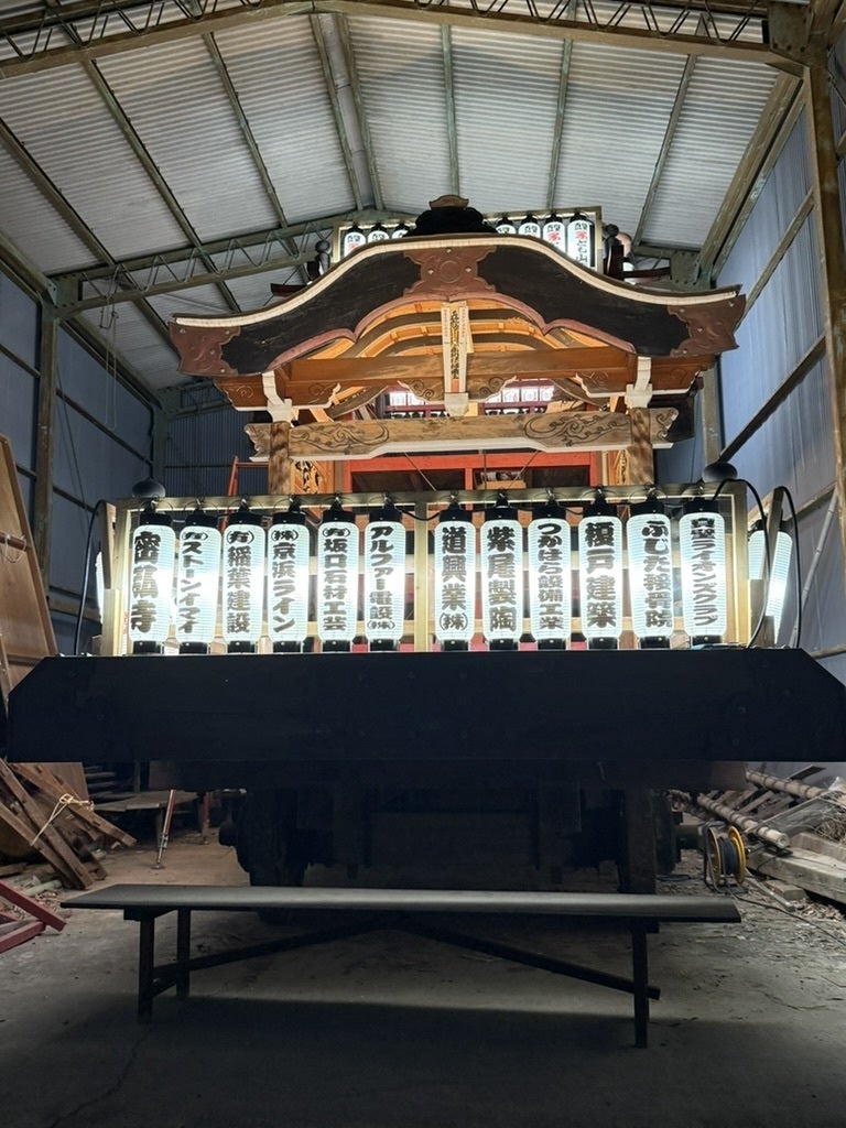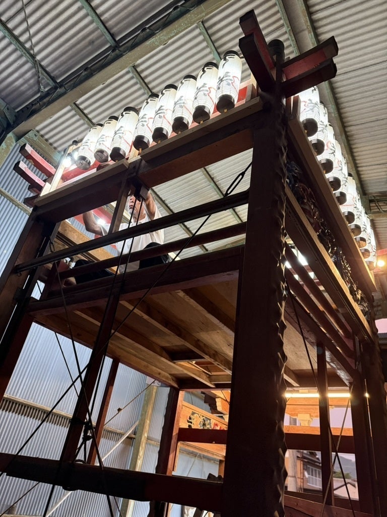 昨晩、真壁子ども山車に提灯が取り付けられ点灯しました。