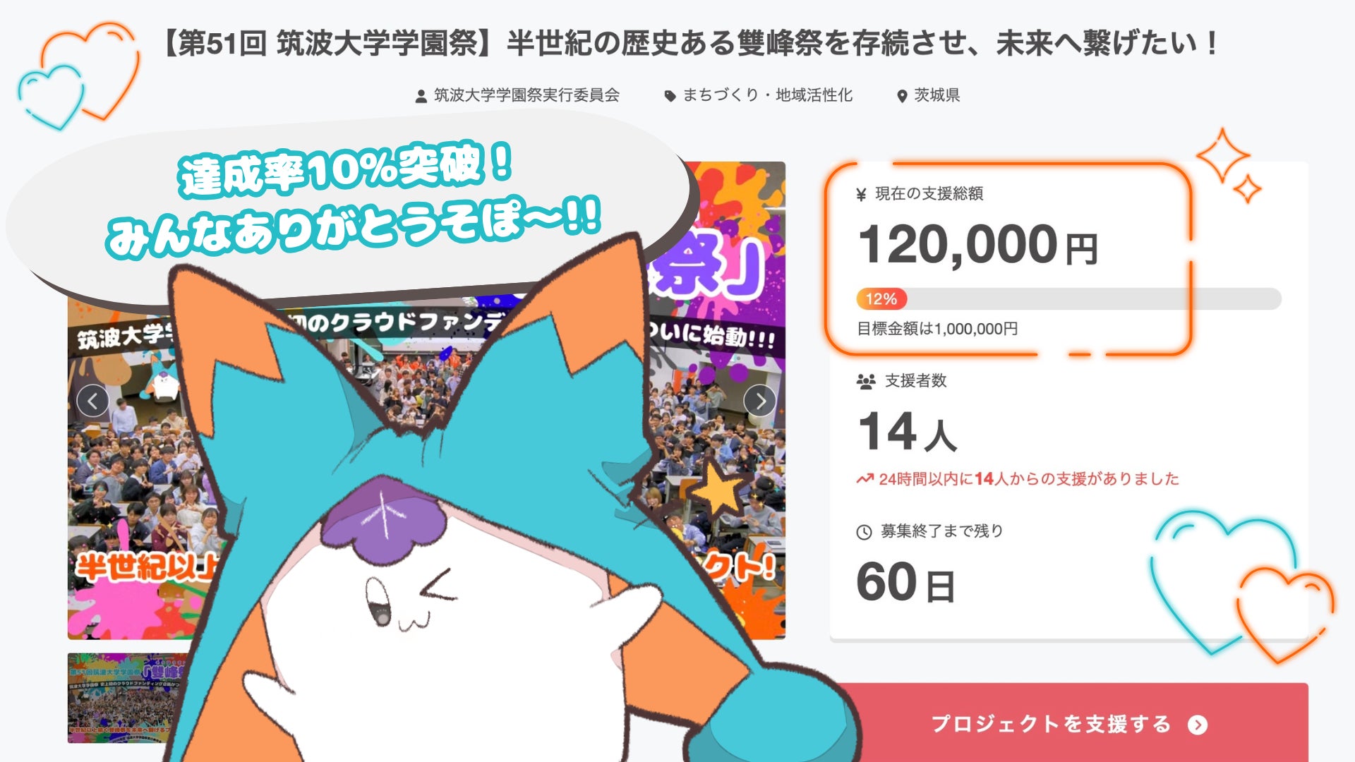 この成果はひとえに、プロジェクト開始前よりお気に入り登録やSNSでの拡散にご協力いただき、プロジェクトの存在を多くの方々に届けてくださった皆さまの心強いお力添えあってのことでございます。学園祭実行委員一同、皆さまの温かいご支援・ご協力に心より感謝申し上げます。