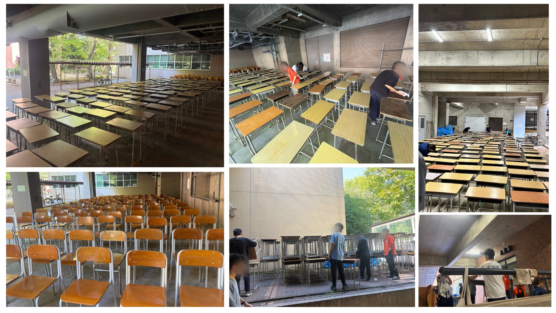 これは、実行委員が机・椅子をひとつひとつ手作業で拭いて清掃している様子です。これらの机や椅子は実行委員が所有する備品として雙峰祭当日に企画団体へと貸し出され、各企画の円滑な運営を支えています。数百を超える膨大な数を協力して運び、整備しながら、午前中だけでこの作業を終わらせます。肉体的にも精神的にも非常に大変な作業ではありますが、このような裏方の準備があるからこそ、雙峰祭が安全で楽しいイベントとして成り立っているのだと感じます。