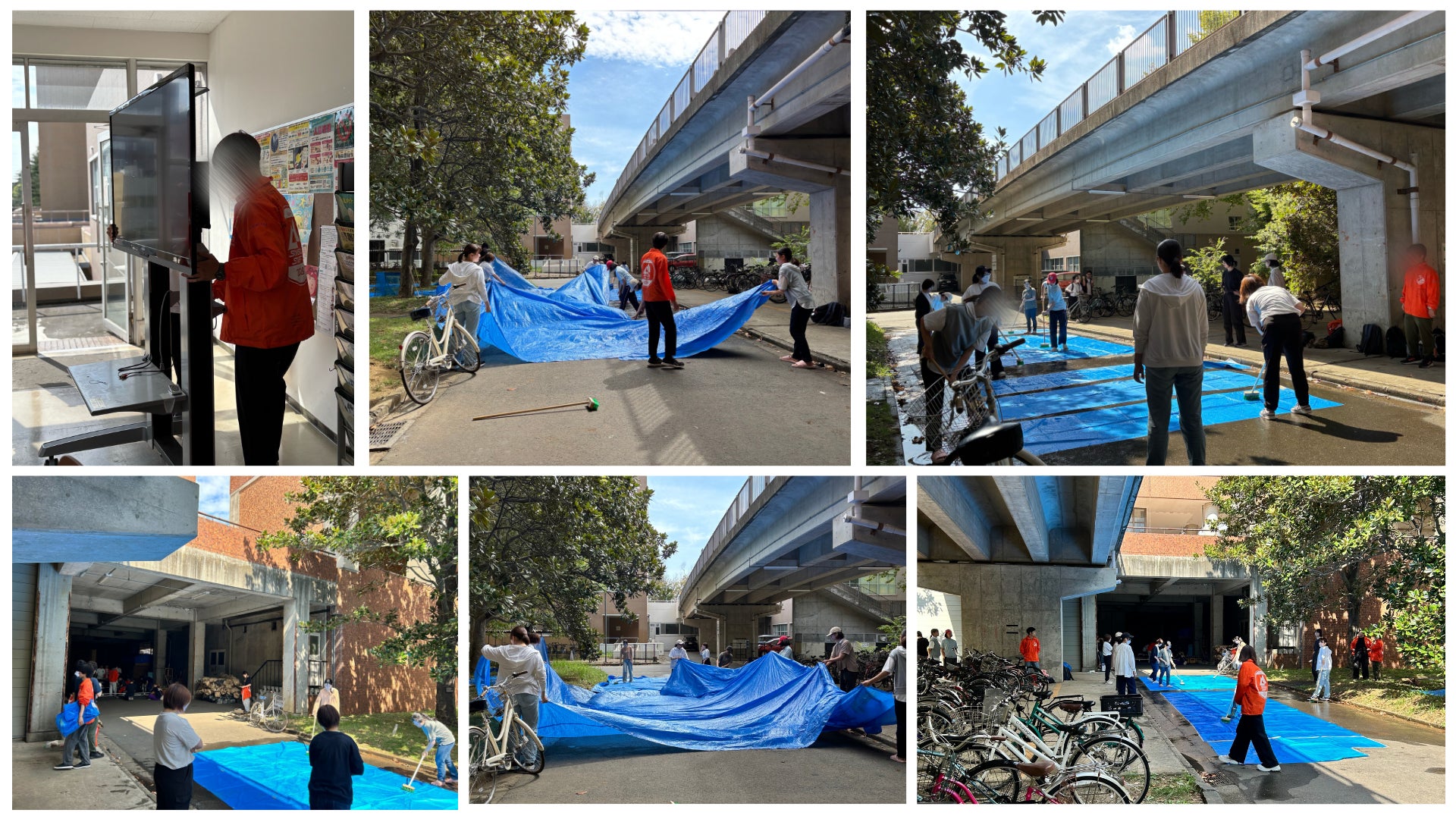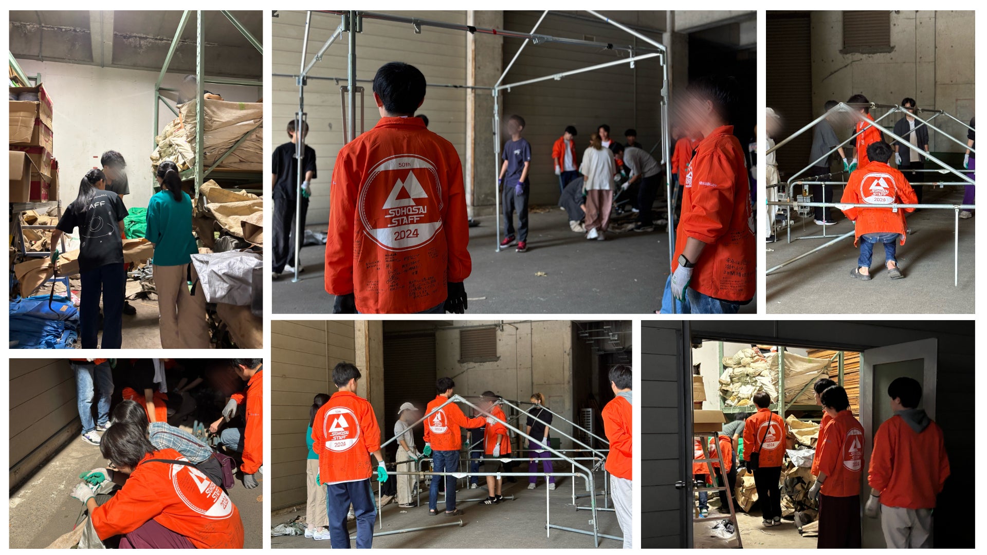 また、このように、テントの骨組みがきちんと揃っているか、安全にテントを立てることができるかどうかを実際にテントを組み立てて確認する作業もあります。こちらのテントも実行委員が所有する備品として雙峰祭当日に様々な場面で使用され、各企画の運営を根底から支えているものです。