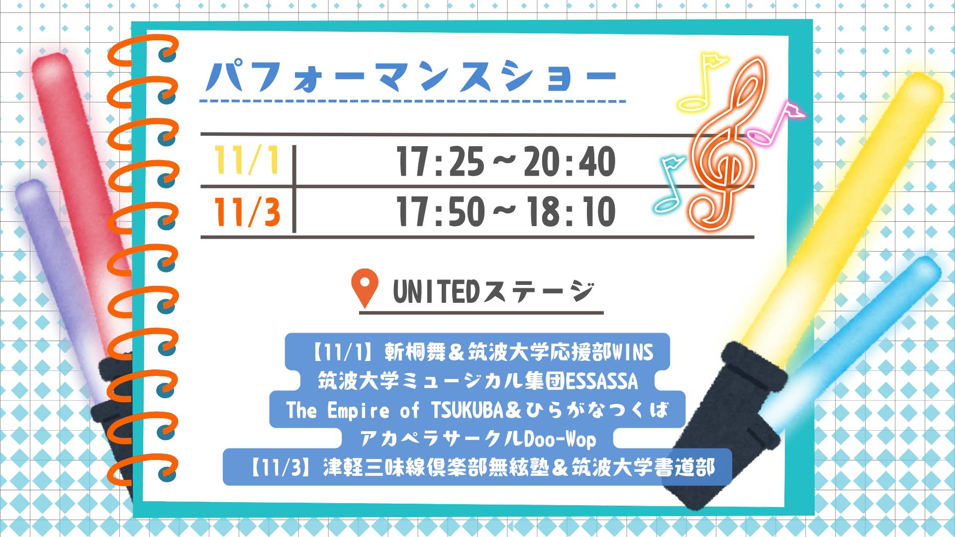 【パフォーマンスショー】では、筑波大学の各サークルによるパフォーマンスを楽しむことができます!出演サークルの詳細につきましては、以下の動画をご覧ください。
