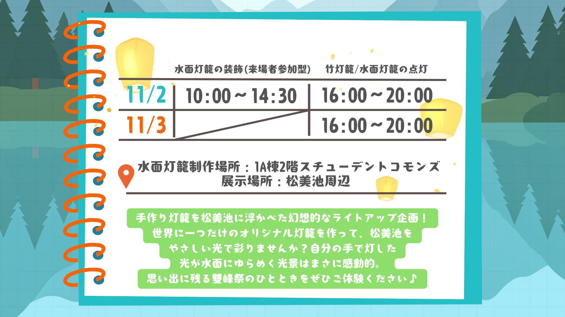 【松美池ライトアップ企画】では、世界に一つだけのオリジナルの灯籠を作成して松見池を華麗に彩ることができます!