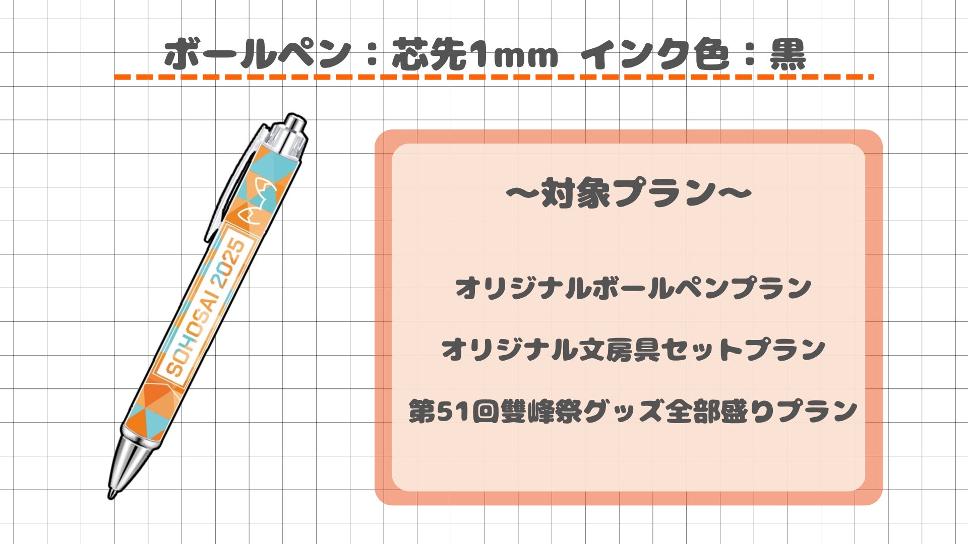 長らく調整中であった雙峰祭公式グッズ「ボールペン」につきまして、正式なイメージ図を公開いたします。ボールペンが含まれる対象プランは右図の通りとなりますので、該当の支援者の皆様におかれましては、必ずご確認のほどをよろしくお願い申し上げます。
