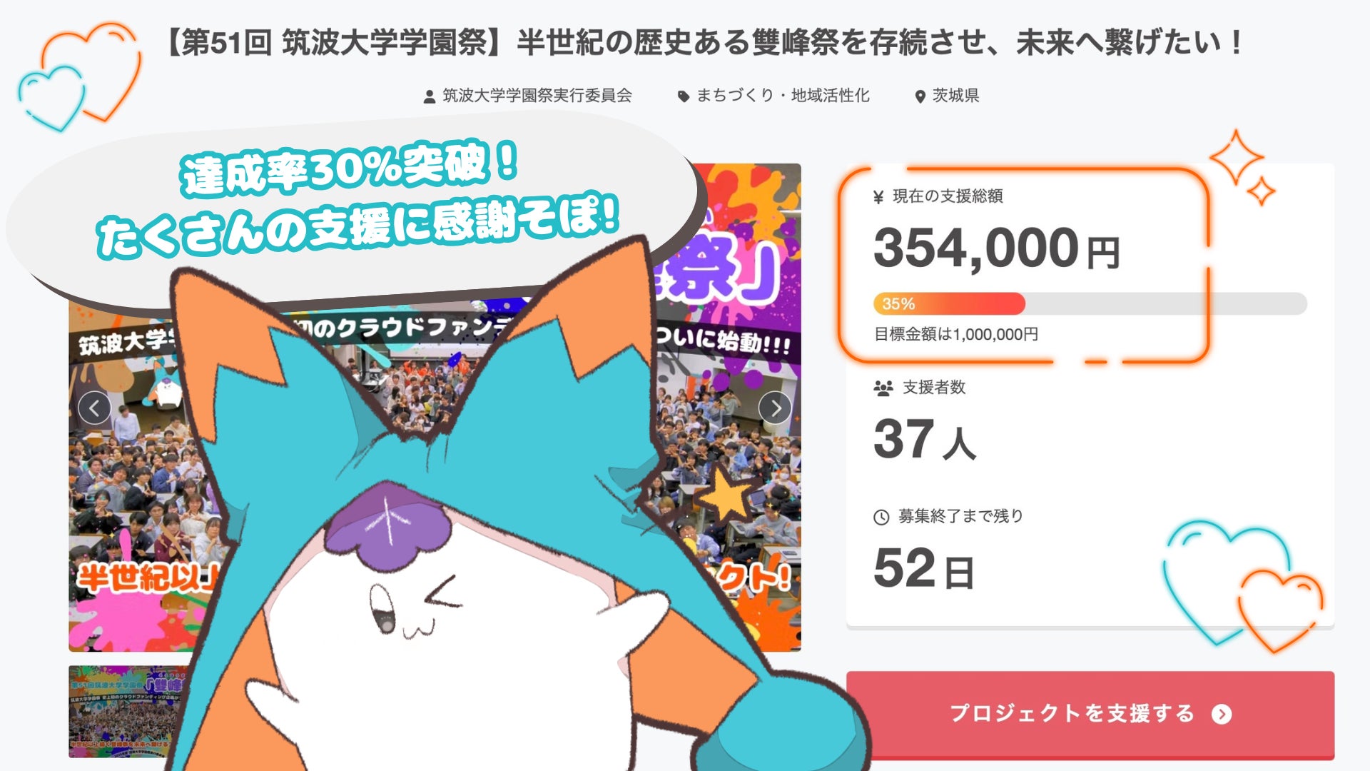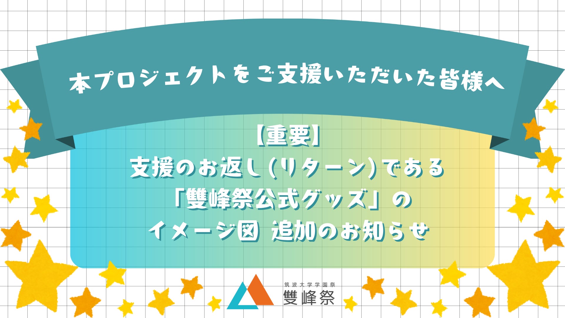 いつも大変お世話になっております。第51代 筑波大学学園祭実行委員会です。この度、本プロジェクトの支援のお返し(リターン)としてご用意しております「雙峰祭公式グッズ」につきまして、各グッズのイメージ図を新たに追加させていただきました。ご支援の受付開始から時間が経過しているにもかかわらず、リターン内容の具体的なご案内が遅れてしまいましたこと、深くお詫び申し上げます。なお、本件に関しましてご不明な点やお気づきの点がございましたら、恐れ入りますが以下の連絡先までご一報いただけますと幸いです。【ご連絡先:sponsorship@sohosai.com】今後とも、雙峰祭および本プロジェクトを温かく見守っていただけますと幸いです。引き続き、何卒よろしくお願い申し上げます。