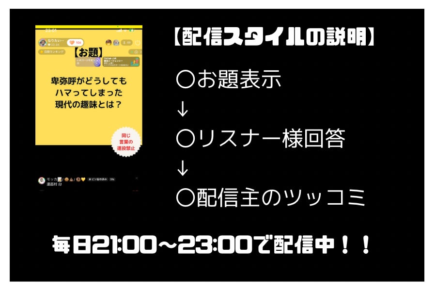 大喜利の配信を毎日することで、リスナーさんが一日の最後を笑顔で終えることが出来ており、こんな素敵なことはないと毎日実感しています。