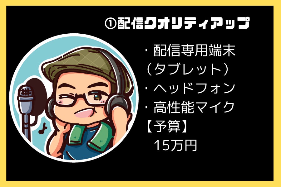 現在配信専用の端末(タブレット)がないので、配信専用のタブレットを用意して、配信のクオリティアップを目指しております。合わせて、ヘッドホンとマイクのグレードアップも考えております。
