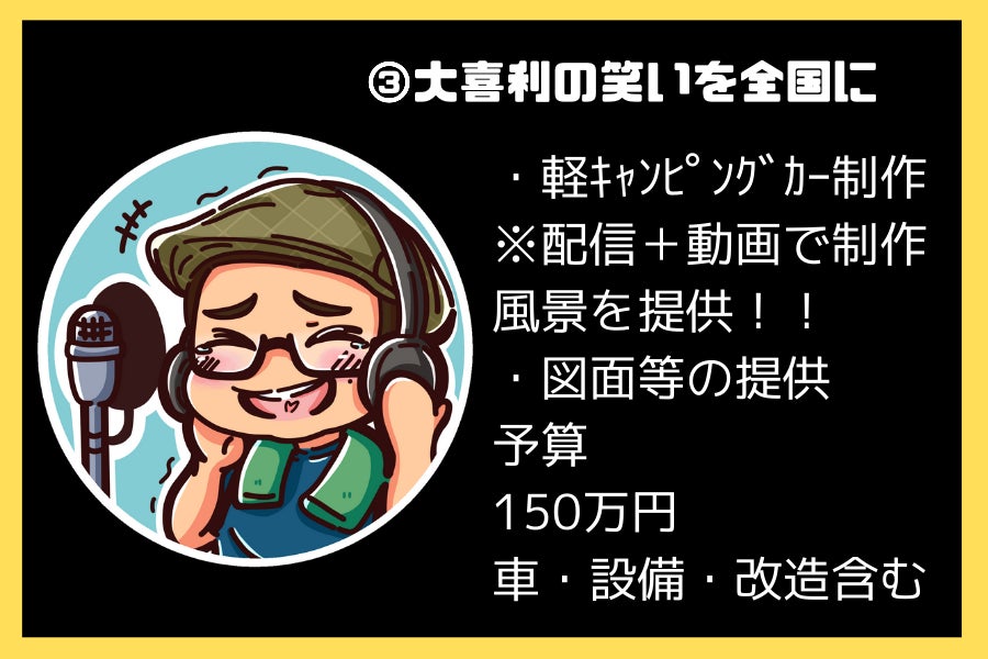 私が大喜利配信を始めたきっかけは、日常に笑いをもたらすことの素晴らしさに気づいたからです。笑いには人の心を軽くし、幸せをもたらす力があります。しかし、配信を続ける中で、より多くの人にこの笑いを届けるためには、配信クオリティの向上が必要であることを痛感しました。それが今回のクラウドファンディングを立ち上げる決意をした理由です。