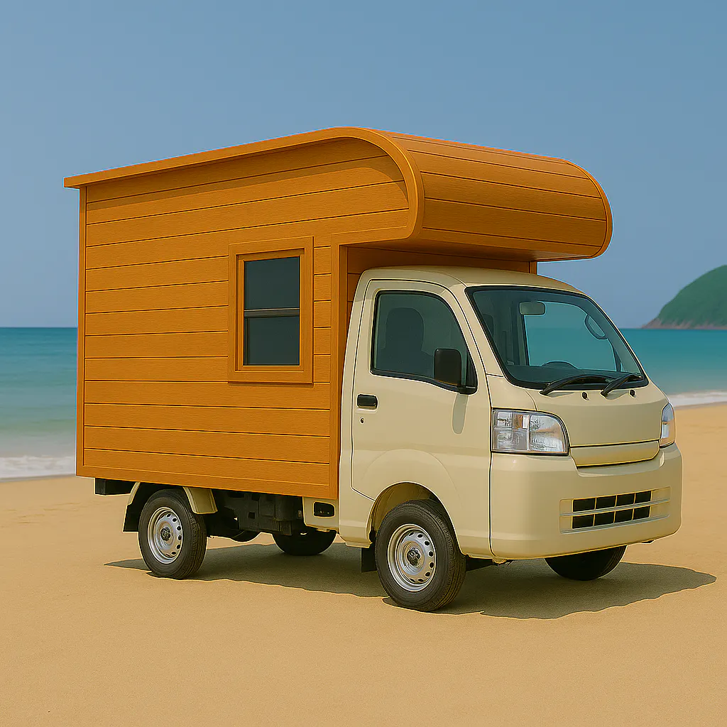 具体的には、軽トラックの荷台に箱型の家を作りそこに住みながら大学に通います。