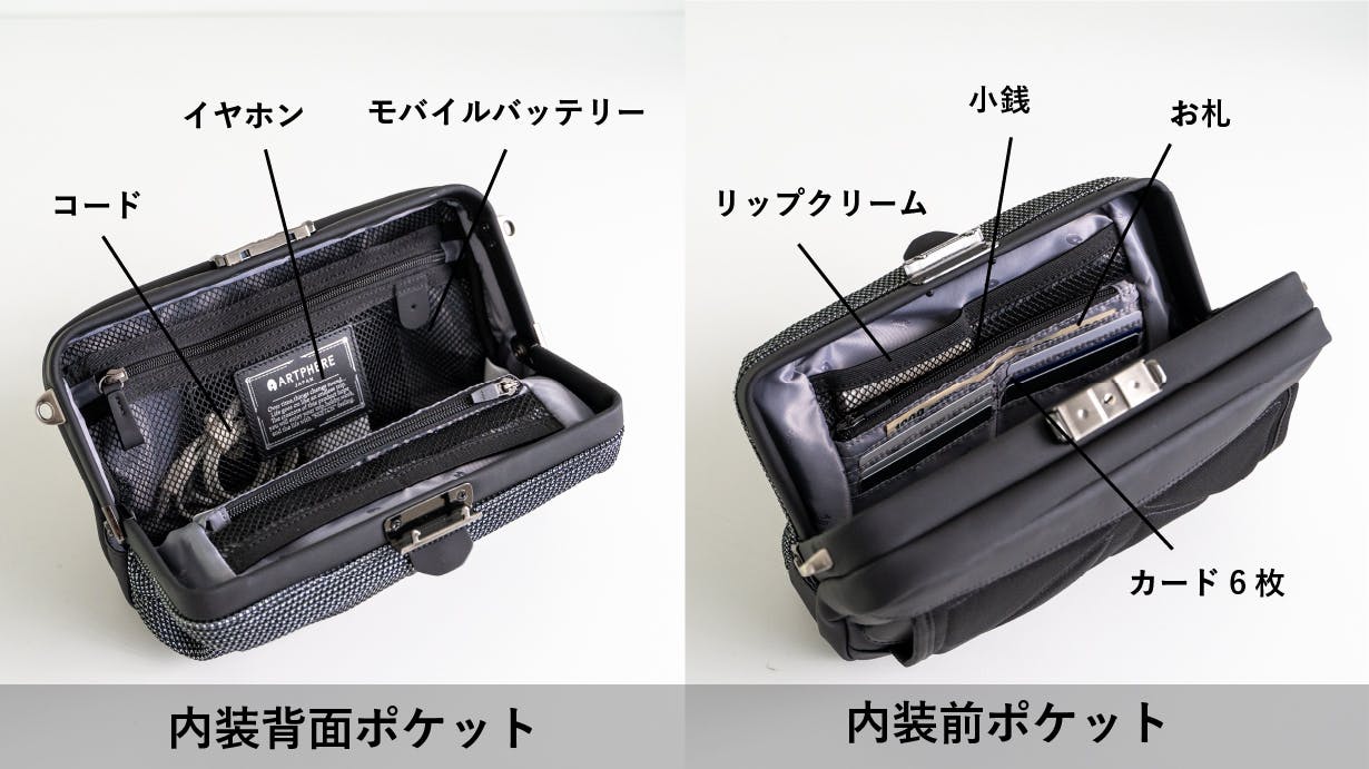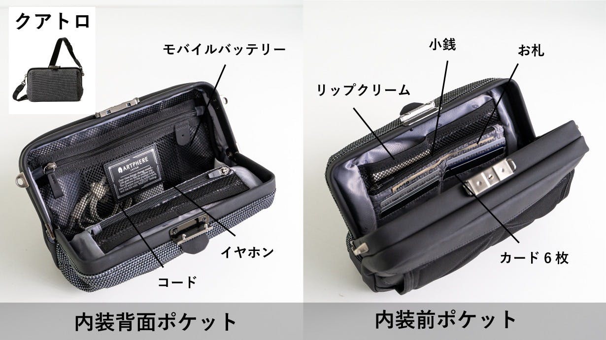 クアトロタイプ: - メイン収納部分は機能ポケット付き。メッシュ素材なので視認性も高く取り出したいものを瞬時に見分けられます。バッグの中に財布の機能を一体化しています。カード6枚収納可。財布いらずとなり、バッグから財布を出し入れしなくて済みます。レジ前でまごつきを解決します。クアトロタイプは鍵付きです。