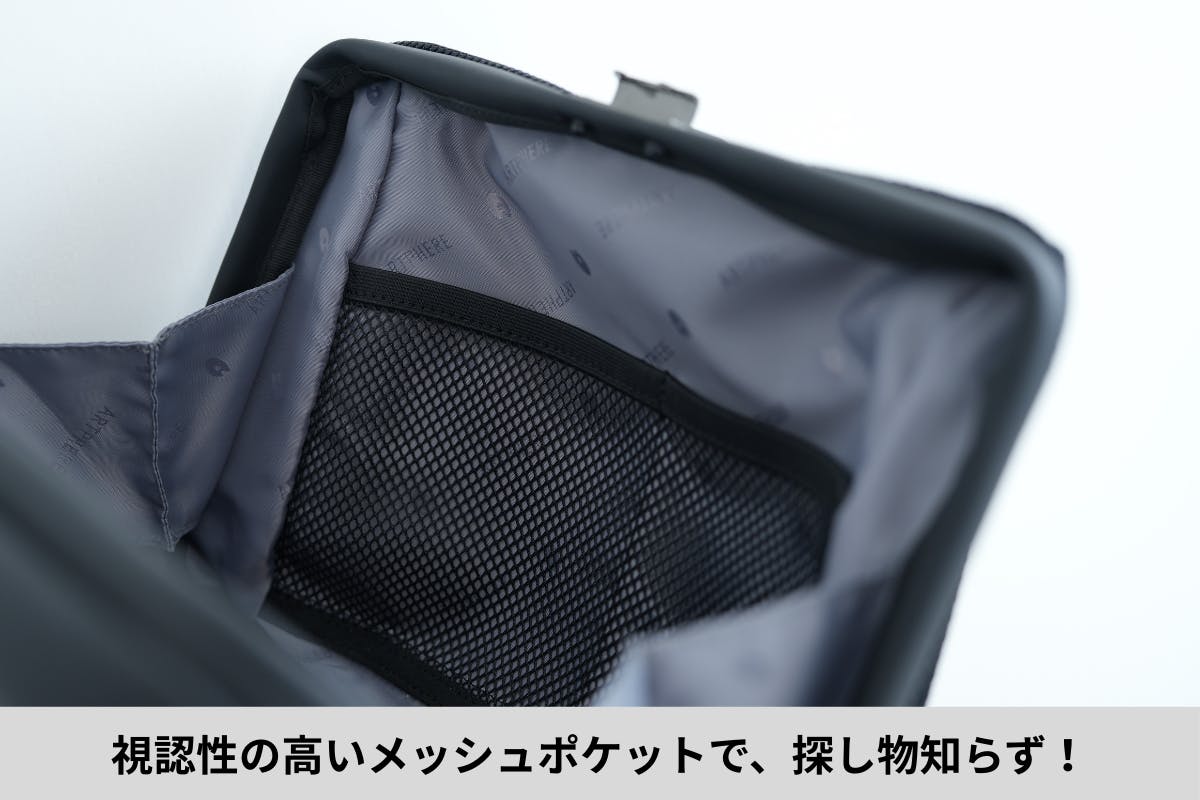 - メイン収納部分はiPadやゲーム機にも使用できる機能ポケット付き。生地同士がくっつくことで荷物をフィットさせることができます。前側にもポケットがあり、メッシュ素材なので視認性も高く取り出したいものを瞬時に見分けられます。