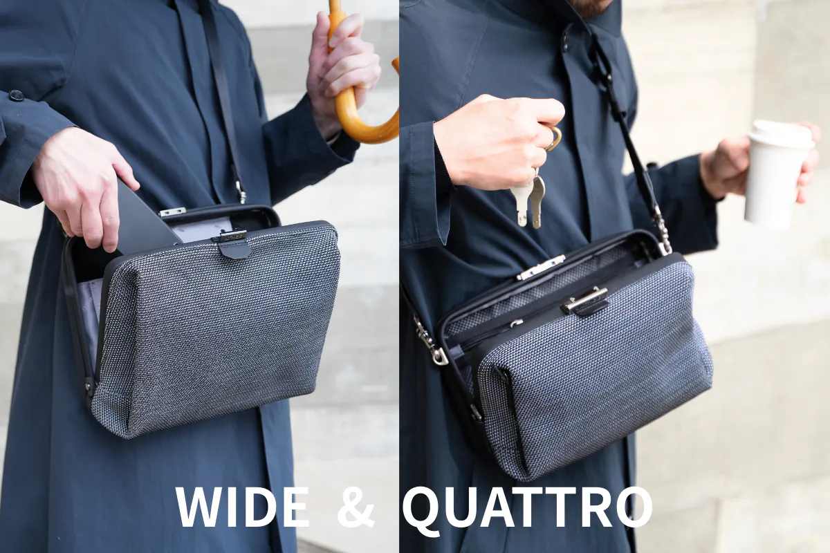 クアトロタイプ: - メイン収納部分は機能ポケット付き。メッシュ素材なので視認性も高く取り出したいものを瞬時に見分けられます。バッグの中に財布の機能を一体化しています。カード6枚収納可。財布いらずとなり、バッグから財布を出し入れしなくて済みます。レジ前でまごつきを解決します。クアトロタイプは鍵付きです。