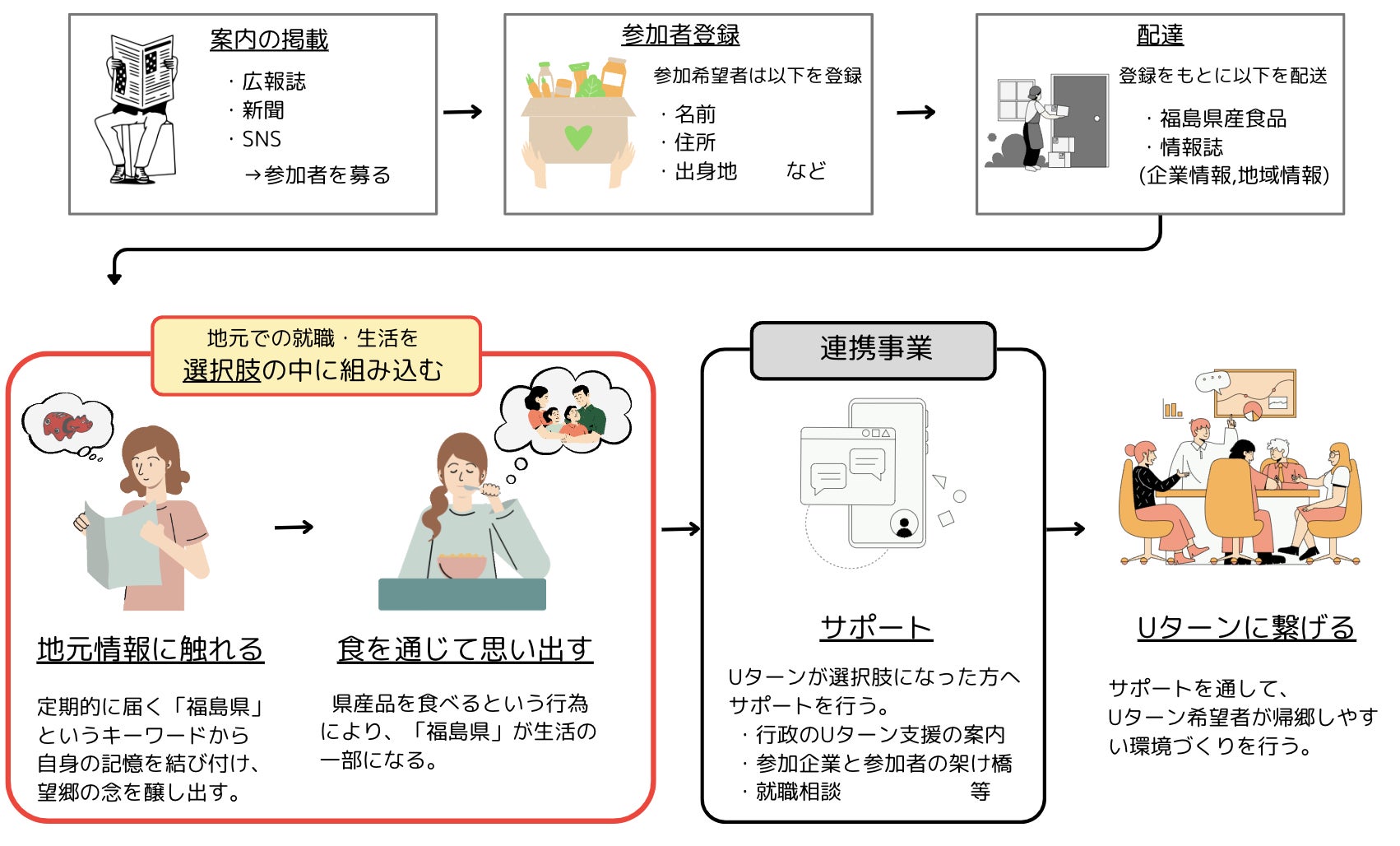 地元との繋がりを保ち、帰郷へのきっかけからその実現に向けたサポートを行う。