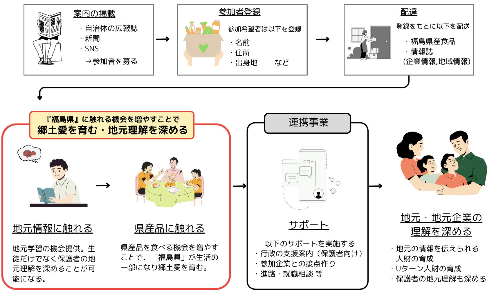 「ぽーぽいプロジェクト」は、人口減少・若者の流出という福島県の課題に対して、Uターンの促進による課題解決を試みるプロジェクトです。またプロジェクトを通して、地元企業の知名度向上を図るものでもあります。地元との繋がりを保つため「ぽーぽいプロジェクト」では、年に2回、プロジェクト参加者に福島県産食品と地域情報や企業情報を記載した情報誌を送付します。それに加え月1回地域情報をメールでお送りします。