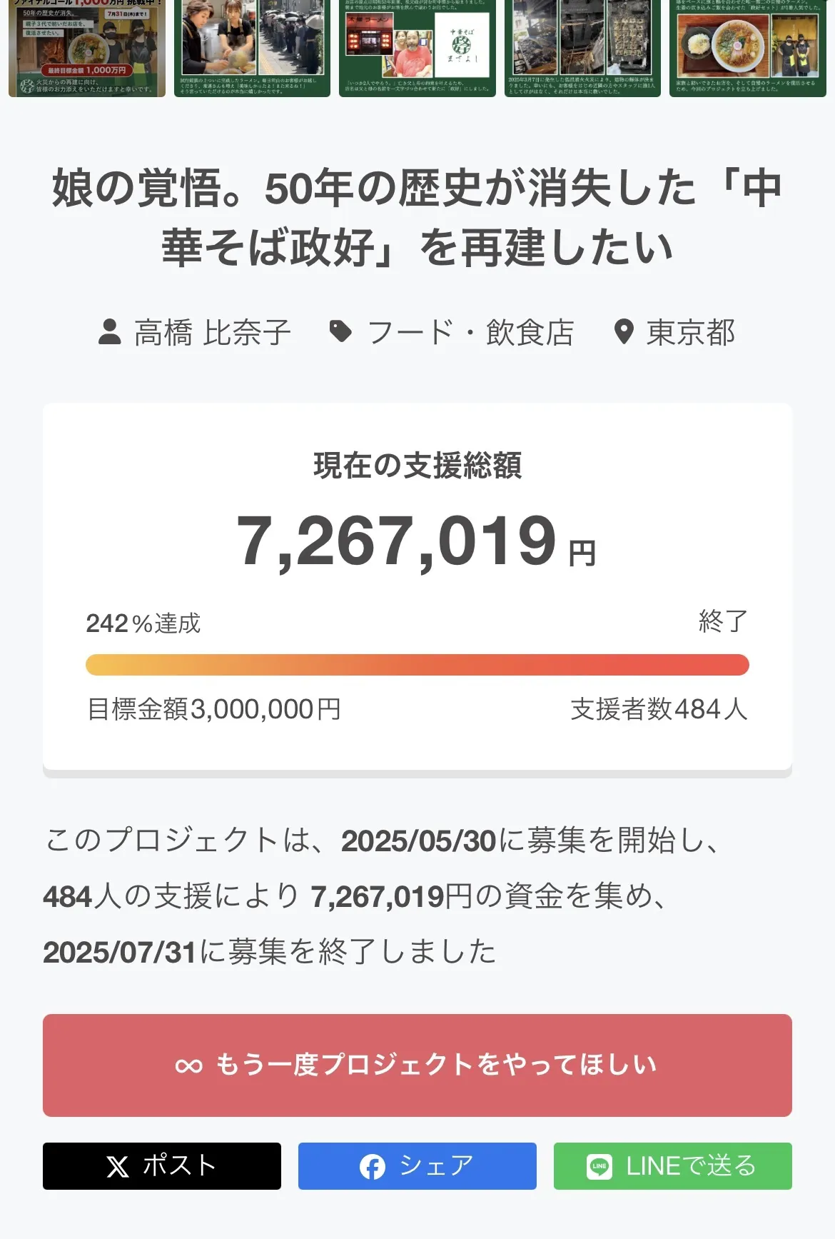 このたびは「娘の覚悟。50年の歴史が消失した"中華そば政好"を再建したい」のプロジェクトに、温かいご支援をいただき、本当にありがとうございました。