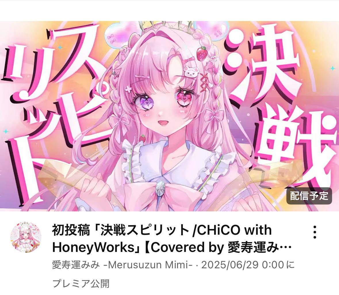 ついに!!!愛寿運みみYouTube初投稿の歌ってみた【決戦スピリット】プレミア公開6/29 お昼12時!!!YouTubeではVsingerとして活躍したい、みんなに元気をお届けしたいみみが初となるYouTubeでの歌ってみた!!についてですが、先ほどプレミア公開にしました。6/29のお昼12時以降誰でも視聴可能です!◎ みんなの勇気を応援したい気持ちから選んだ一曲です。最後までクラウドファンディングも走り抜けます!!https://youtu.be/oMHXmlUd2T4?si=YUAdbW6kL7IGG5Ad