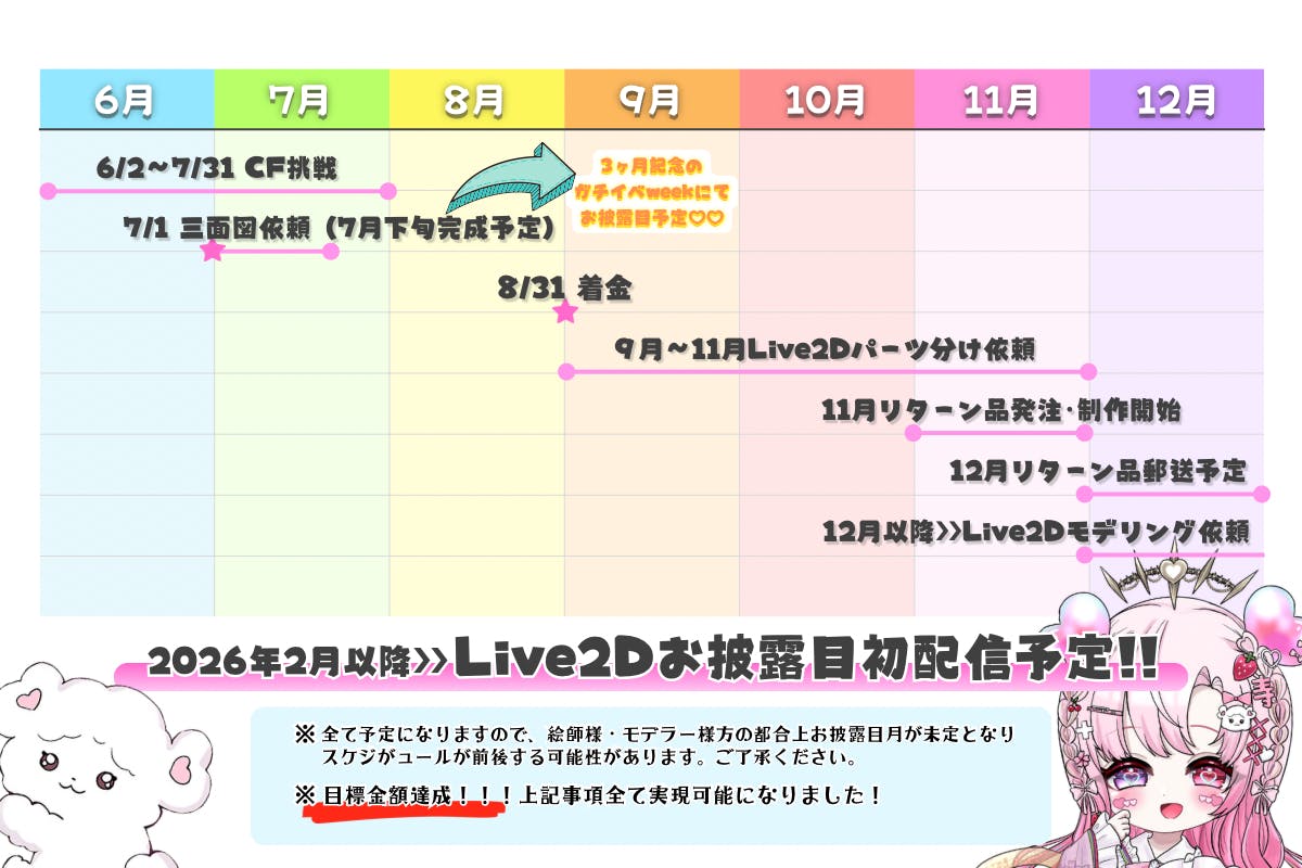 愛寿運みみのお母様に三面図は現在着手いただいております。Live2Dパーツ分けの金額は達成しましたので、お母様に8月末からの着手予約を早速させていただきました♡♡⸜(。˃ ᵕ ˂ )⸝