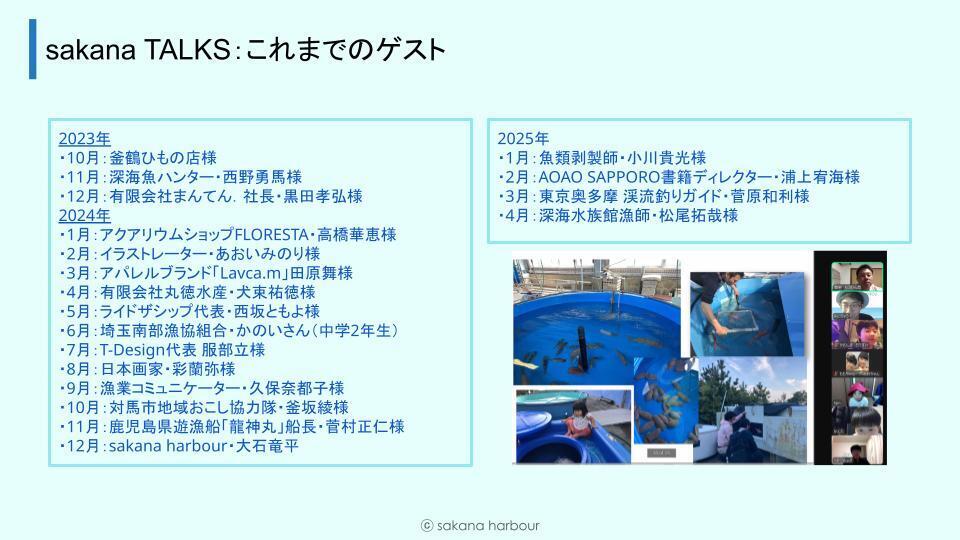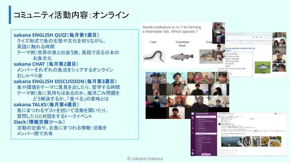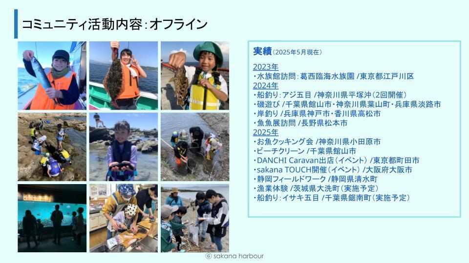 sakana harbourは、「おさかなからはじまる ぼうけんがある」をスローガンに、お魚・釣り・旅をテーマに好奇心を広げ、新たな人や文化と出会い、やってみたいをやってみる、全国から仲間が集まるお魚コミュニティです。