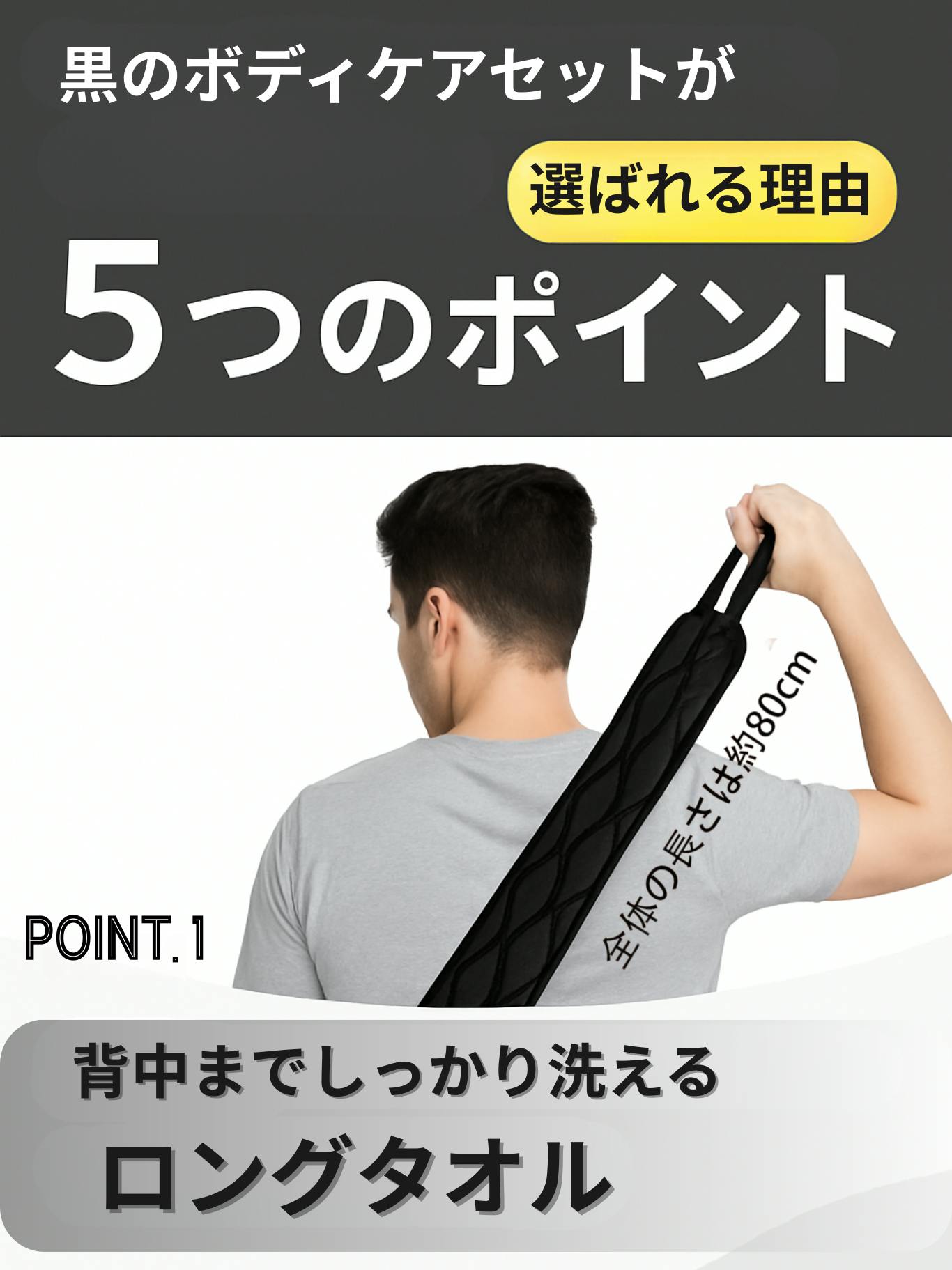 だからこそ、この【黒のボディケアセット】では、男性の体格にしっかりフィットする「約80cm」のロング設計に。背中全体にタオルがしっかり当たって、ひと拭きで爽快な洗い心地を実現しました。