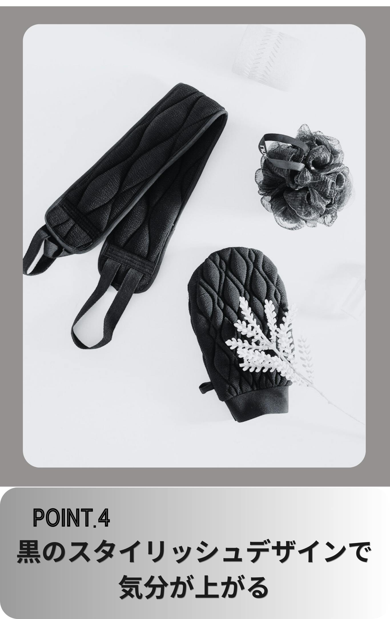 今回ご紹介する黒のボディケア3点セットは、ロングタオル・ミトン・ボディボールを組み合わせた、全身のケアがこれひとつで完結する構成。