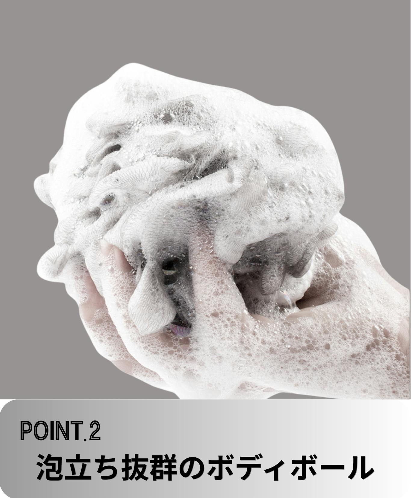 この【泡立ちボディボール】は、ほんの少量のボディソープでも、ふわっと軽くなでるだけでもこもこの濃密泡がたっぷり広がります。