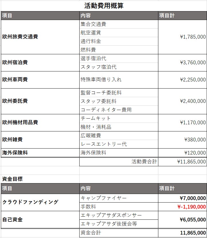 ・本欧州遠征に必要な金額は11,865,000円です。うち6,055,000円を自己資金(スポンサー様、後援会様等)で充当し、残りの額を本クラウドファンディングにて調達予定です。