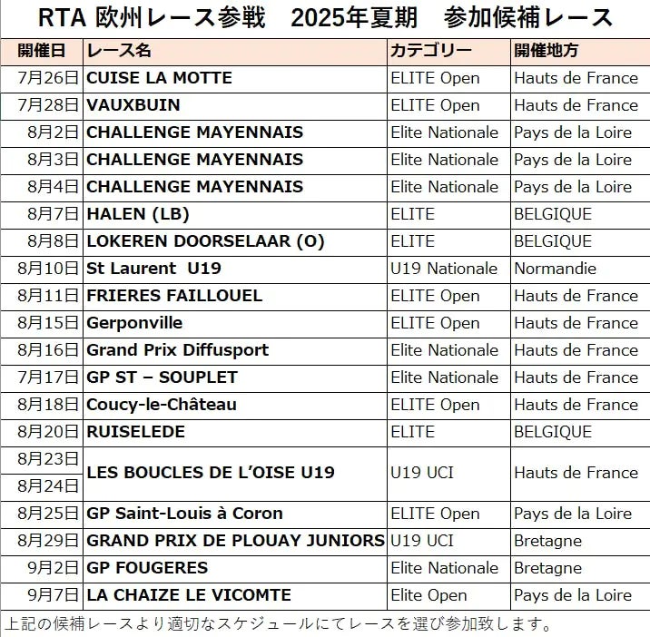 RTA夏期欧州レース転戦 — 参加選手総勢8名が全員フランス入り!本場フランスでUCIレースをはじめとするトップアマチュアレースに挑みます。