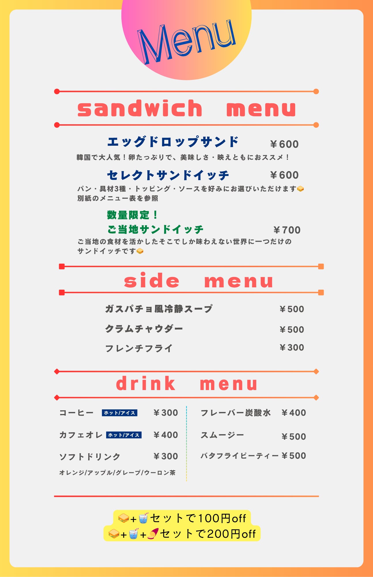 2025/06/22 12:40★メニューが決まりました★〇メインメニューのサンドイッチについて。まずはエッグドロップサンド。韓国で大流行!卵たっぷりの絶品サンドイッチ!そして、セレクトサンドイッチ。パン・具材・トッピング・ドレッシングお好みをお選びいただき、一緒にサンドイッチを作り上げることができます!続いて、ご当地サンドイッチ。こちらは各名産品を活かしたサンドイッチを数量限定でご提供していきます!全メニュー心を込めてお届けいたします! もっと見る