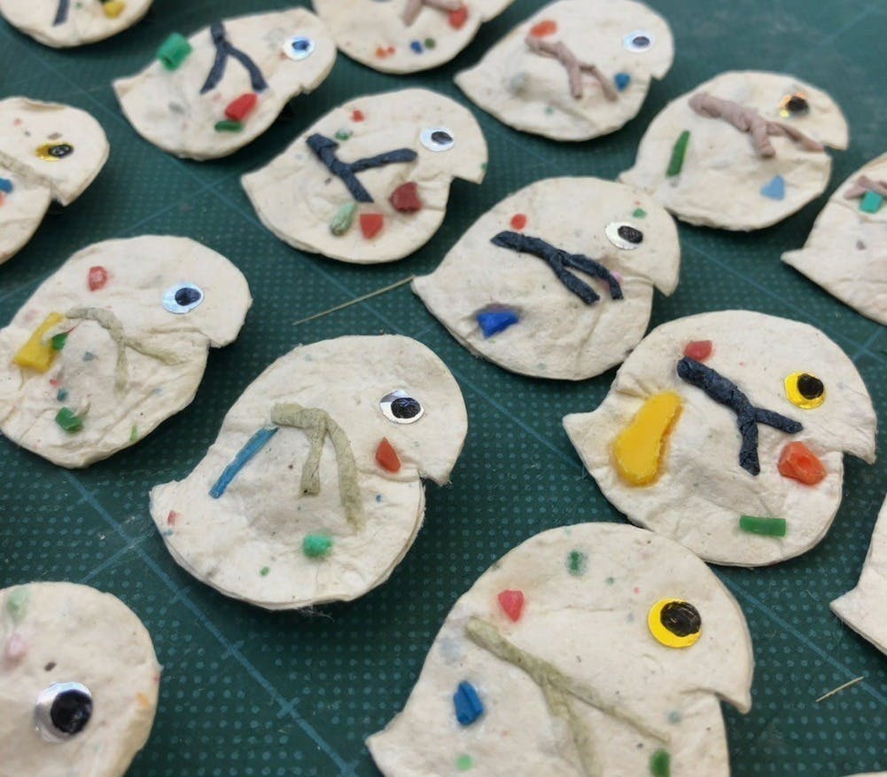 5000円以上の寄付からは、研究者自らが浜辺で拾ったマイクロプラスチックで作成した作品を提供いたします。こちらはアスカさんという美大の学生さんが手がけて下さりました。マイクロプラスチックを込めて紙をすき、ミジンコの形に切り抜いた作品です。