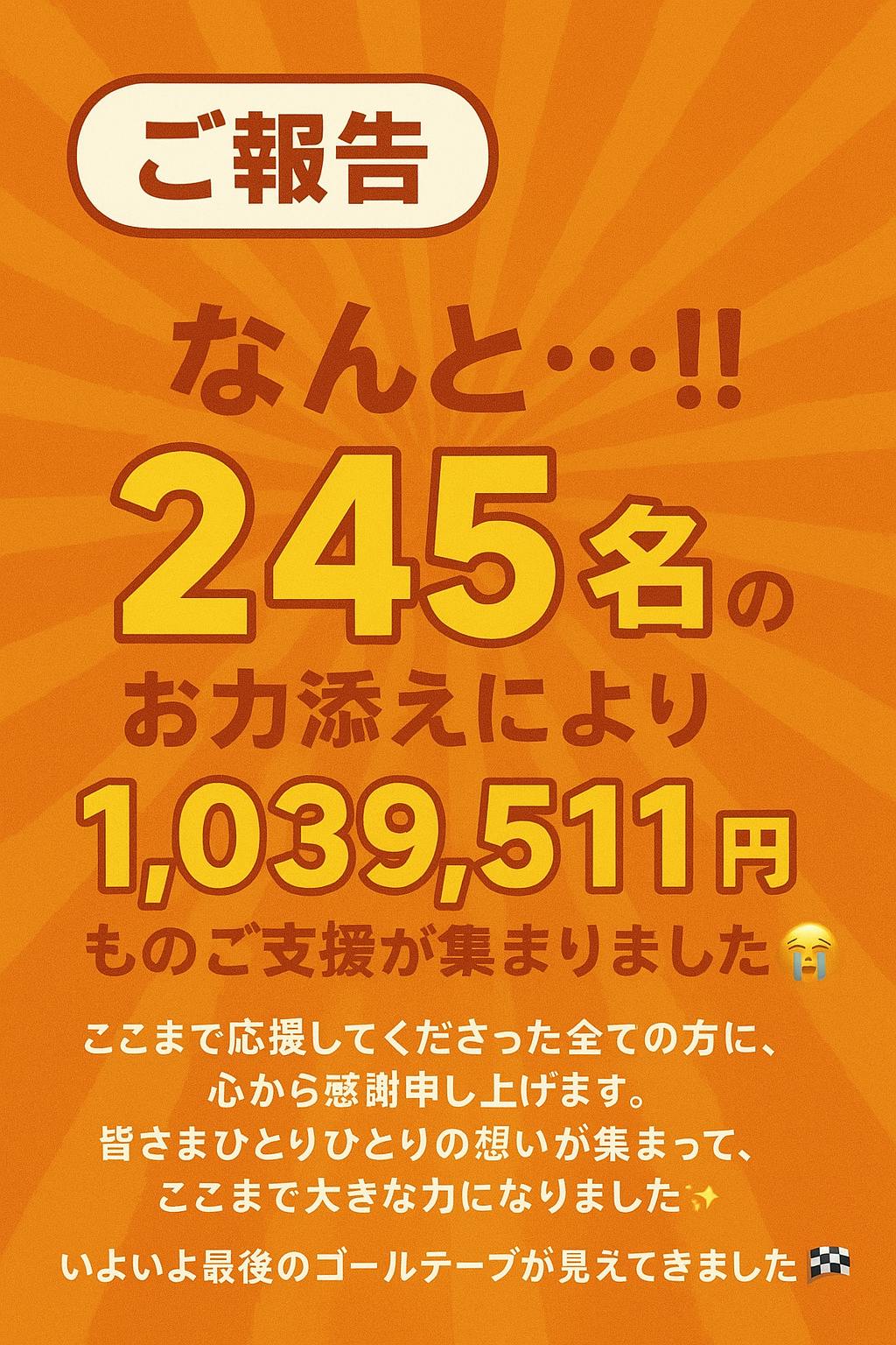 2025/08/31 09:00今日までに【245名】もの方がご支援くださいました( ;∀;)ここまで応援していただけたこと、本当に嬉しく、感謝の気持ちでいっぱいです!ひとりひとりの力が集まって、大きなエネルギーになっています!ここまで一緒に走ってくださった皆さま、本当にありがとうございます!たくさんの応援やシェア、ご支援に支えられてここまで来ることができました最終日ラストスパート!最後の最後まで駆け抜けます!! もっと見る