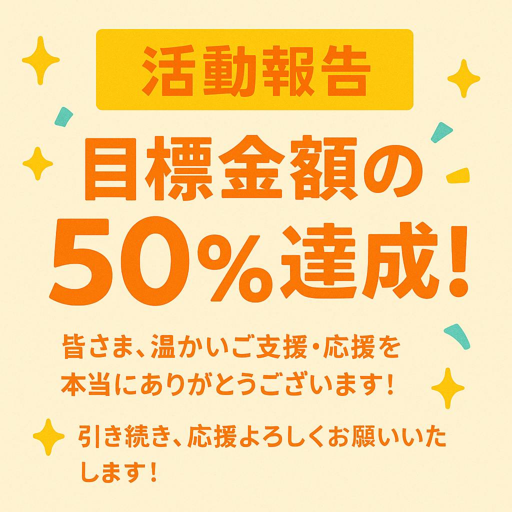 皆さま、温かいご支援・応援を本当にありがとうございます!プロジェクト開始から5日目で、目標金額の 50% を達成することができました!これはひとえに、応援してくださる皆さまのおかげです。心から感謝申し上げます。応援メッセージやSNSでのシェアなど、ひとつひとつの行動が大きな力となっています。「こんなに応援されているんだ」と実感し、胸が熱くなる日々です。残りの期間も、目標達成に向けて全力で取り組んでまいります。まだまだゴールまでは道のりがありますが、どうか引き続き応援・シェア・ご支援のほどよろしくお願いいたします!
