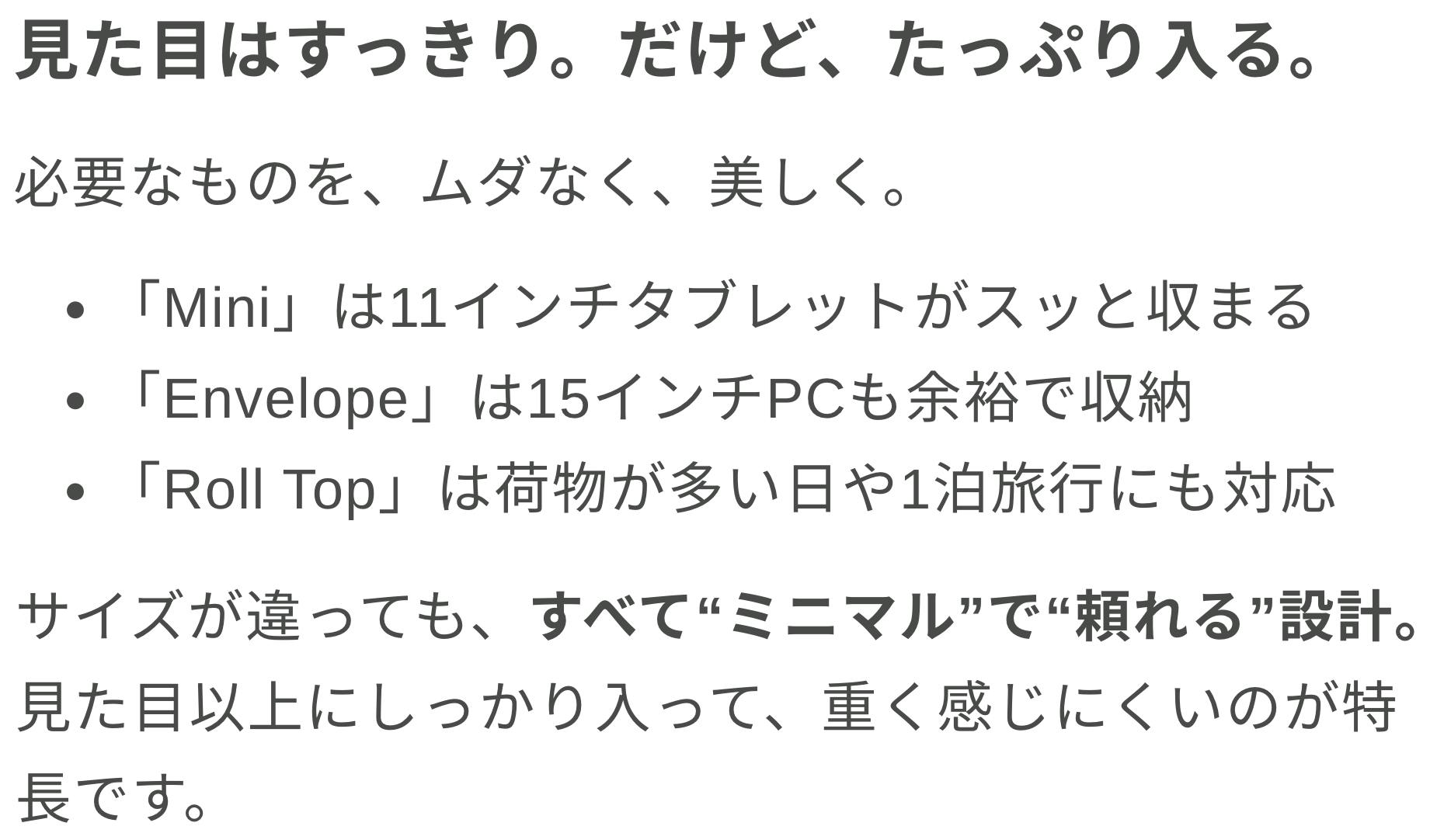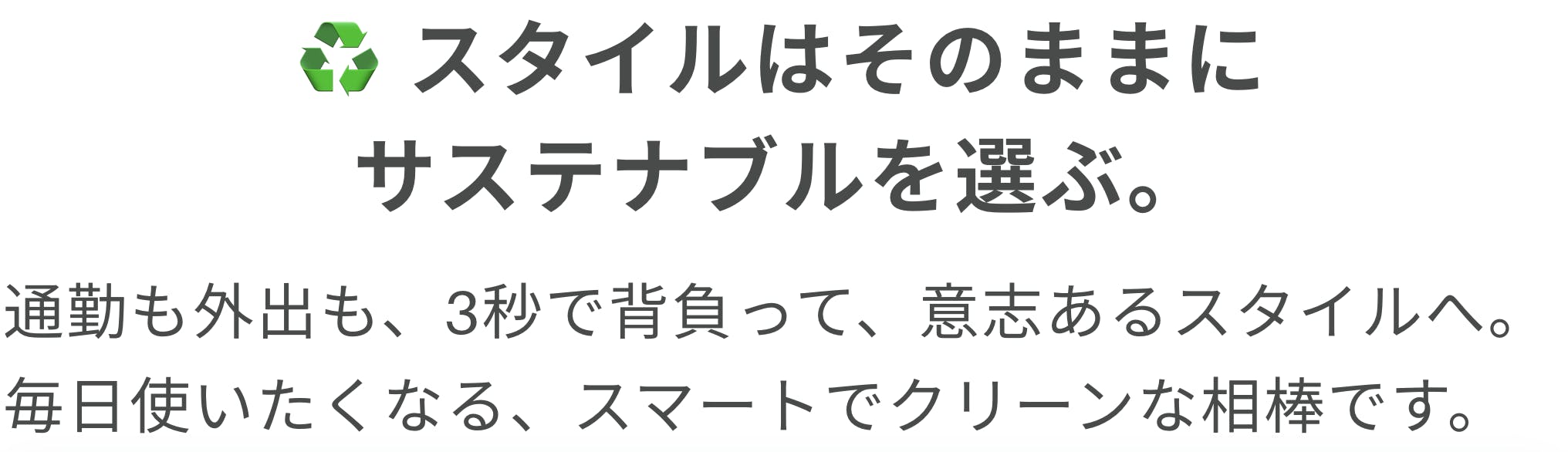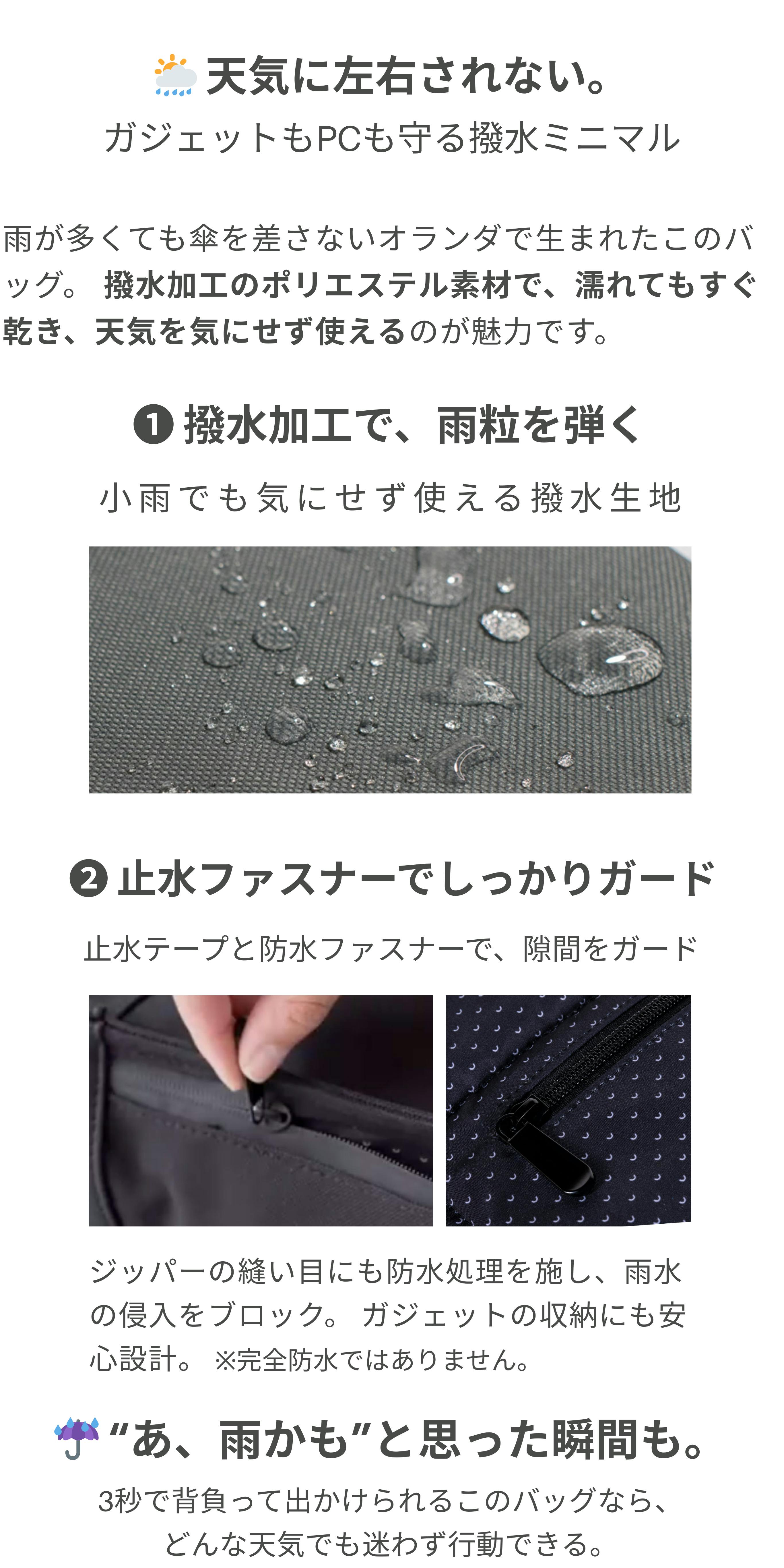 たった3秒でスッと背負えて、心地よく決まる。スーツにも、私服にも、さりげなく寄り添う北欧ミニマルです。