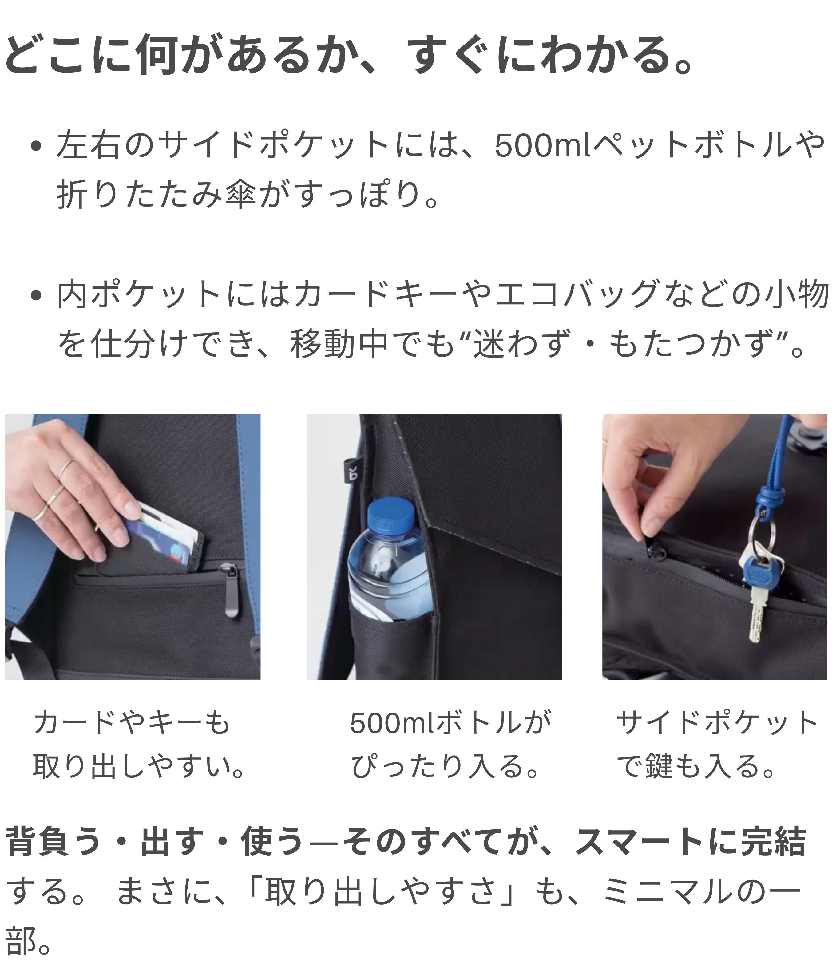 通勤も外出も、たった3秒で背負えばサマになる。見た目の「きちんと感」を大切にしたい大人にこそ嬉しい、整う設計です。