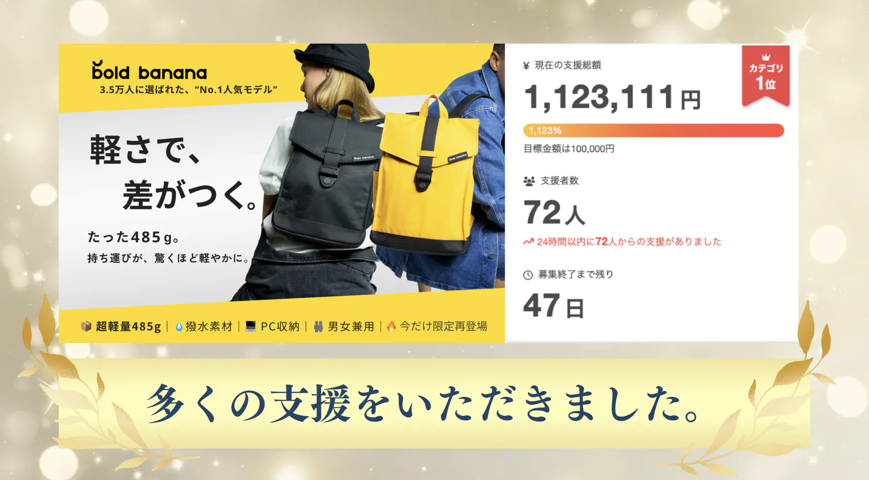 おかげさまで、本プロジェクトは目標金額を大きく上回る112万円以上のご支援をいただき、開始からわずか数日で目標達成することができました。さらに、カテゴリランキングでも1位という大変うれしい結果となりました。
