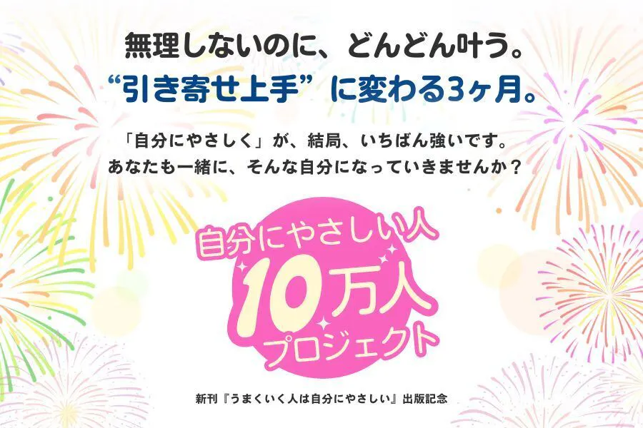 「もっと頑張らなきゃ」「まだ足りない」と、自分に厳しくしてしまう人が多い今の社会。 そんな現実に風穴を開け、「自分にやさしくなることが、成功と幸せのカギである」というメッセージを 10万人に届けたいと本気で思っています。そうでなければ、自分責めをして、他人に不寛容な社会になってしまうからです。