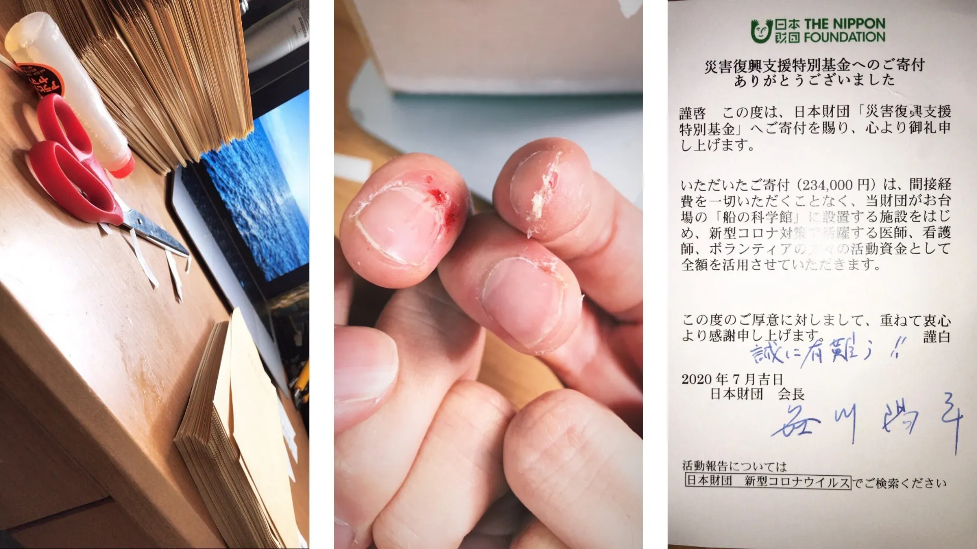 (412名分のステッカーを一人で梱包、日本財団から頂いたメッセージ文)