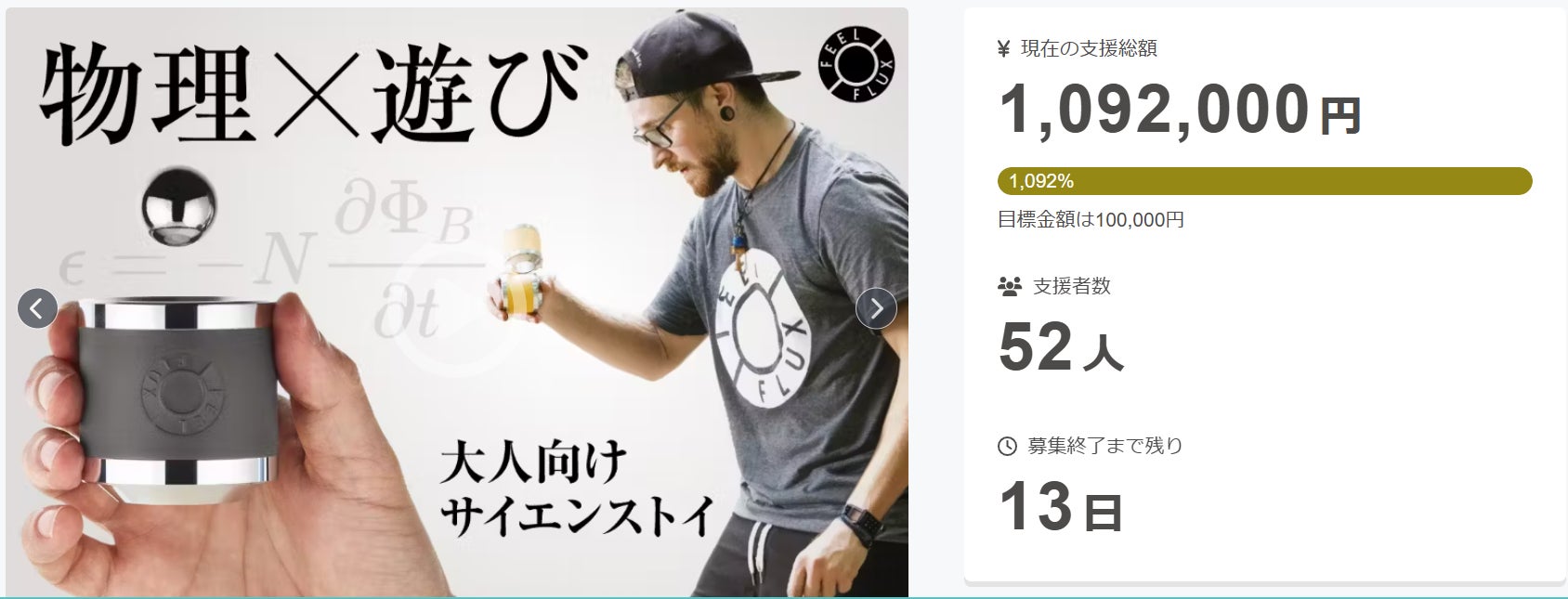 ご支援いただいている皆さまへいつも温かいご支援を賜り、心より御礼申し上げます。FEEL FLUXのプロジェクトも、いよいよ残り2週間ほどとなりました。皆さまからの温かなご支援のおかげで、ここまで歩みを進めることができました。心より感謝申し上げます。プロジェクト終了までの限られた期間、より多くの方にFEEL FLUXの魅力をご覧いただけるよう、最後のフェーズに全力で取り組んでまいります。今後も、サイエンスやスキルトイにご興味をお持ちの皆さまにワクワクをお届けできるよう、心を込めて取り組んでまいります。引き続き、FEEL FLUXをどうぞよろしくお願いいたします。