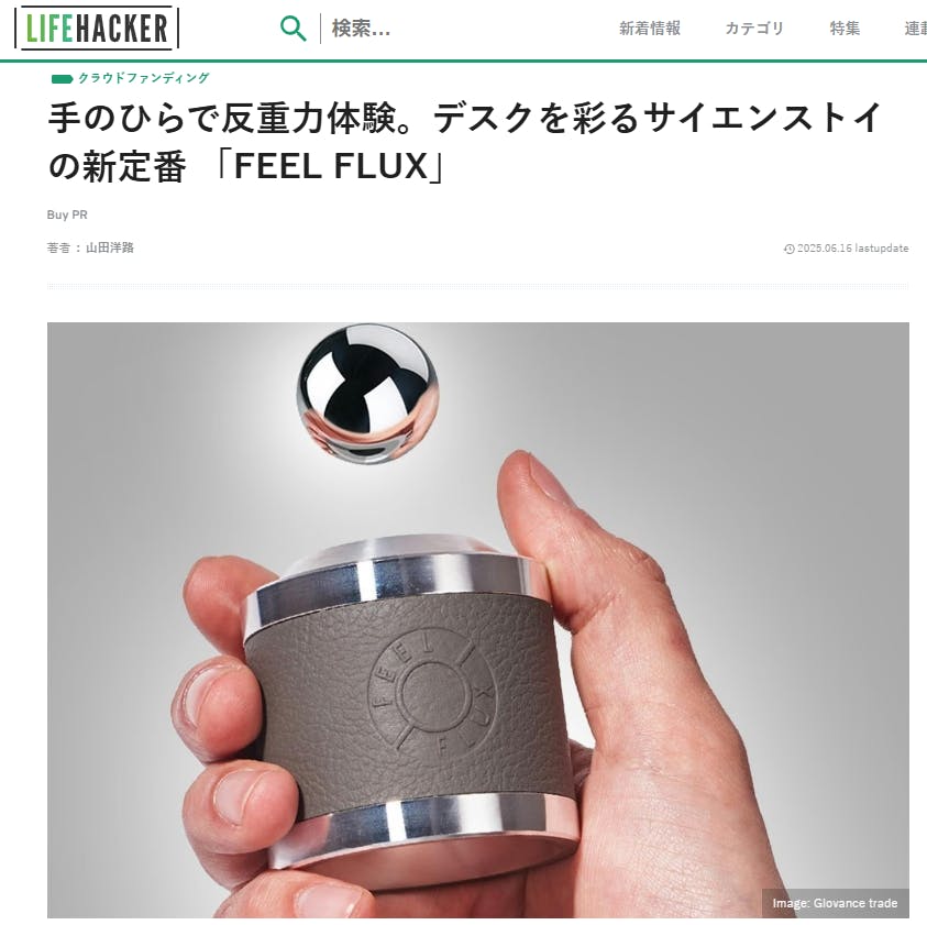 ご支援いただいております皆さまへ平素より温かいご支援を賜り、誠にありがとうございます。このたび、月間2,600万PVを誇る大手ライフスタイルメディア「Lifehacker」にて、FEEL FLUXをご紹介いただきました。▼掲載記事はこちら手のひらで反重力体験。デスクを彩るサイエンストイの新定番「FEEL FLUX」https://www.lifehacker.jp/article/machi-ya-feelflux-start-851522/記事内では、・デスクワークの合間に楽しめる“反重力”の不思議な体験・何度でも挑戦したくなるスキルトイとしての魅力・ハンガリーの職人による丁寧なものづくり・ビジネスシーンでの話題づくりとしても活躍すること…など、FEEL FLUXの魅力をとてもわかりやすくご紹介いただいています。今後も、サイエンスやスキルトイにご興味をお持ちの皆さまにお楽しみいただけるよう、誠心誠意取り組んでまいります。引き続き、温かいご支援のほどどうぞよろしくお願い申し上げます。