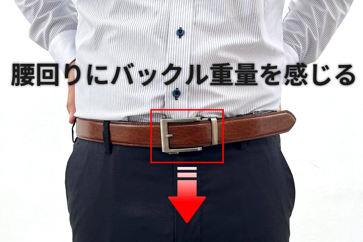 ベルトで一番重たいバックルが体の前面にあることにより、腰回りにベルトの重量を感じてしまいます。