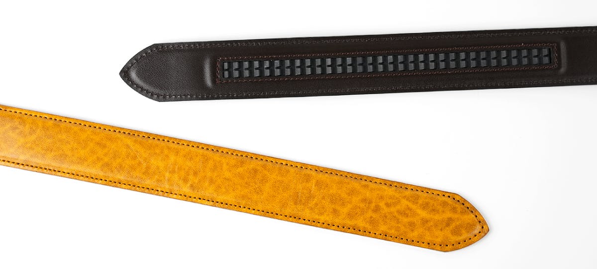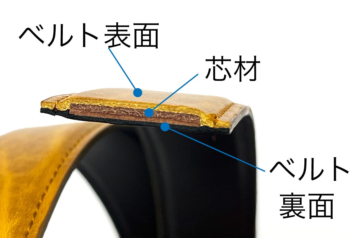 通常ベルト芯材の多くは「ベルト用の不織布」と呼ばれる芯材を使用しているものが多いのが現状ですが、本プロジェクトではベルトの強度を高めるため、芯材には強度のある牛革(床革)を使用しました。またベルト裏面にも牛革(床革)を使用して牛革3層仕立てで強度を高めることにしました。