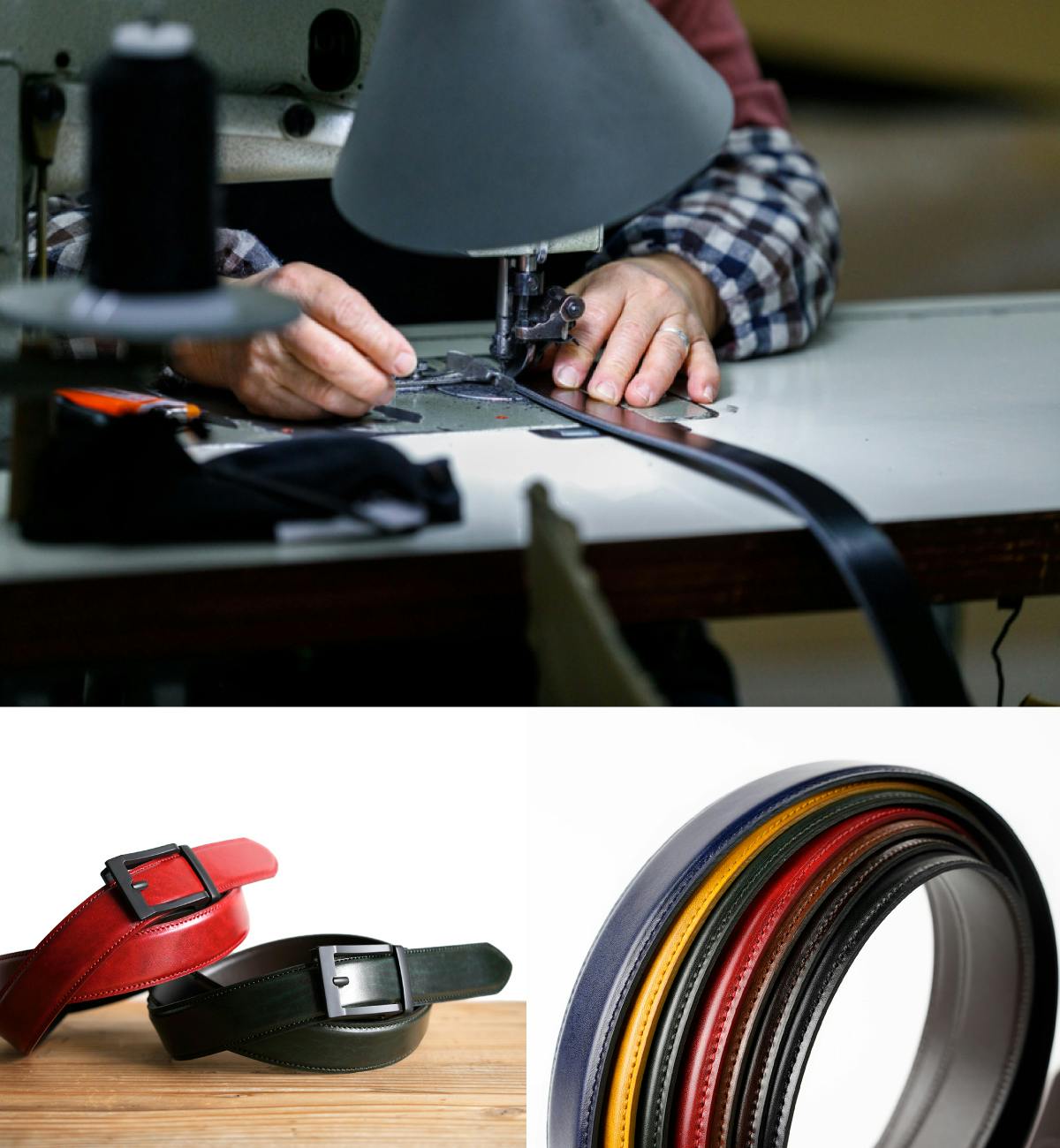 生産は広島県にあるベルト専門工場で、革の裁断から漉き加工・縫製・コバ加工と1点ずつ職人さんにしっかりと作っていただいています。