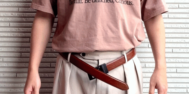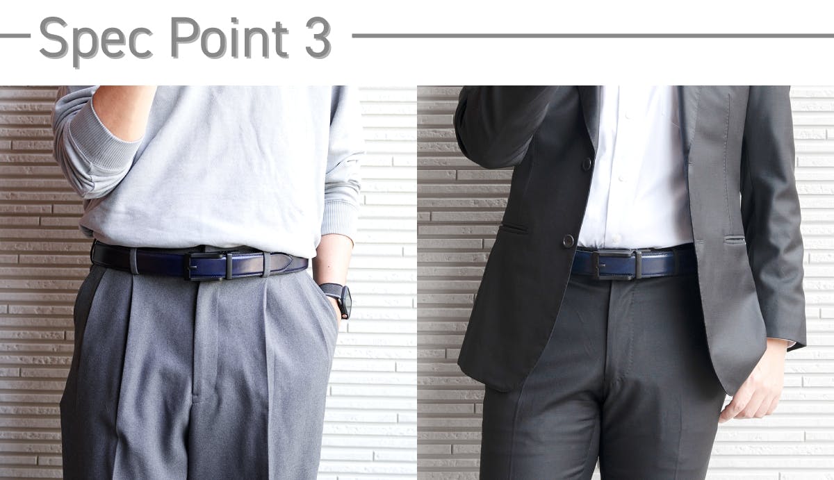 使用するパンツにより股上の位置が変わり、微妙にベルトのサイズが合わないという経験ありませんか?そんなお悩みもラチェット式レールではどんなパンツ・どんなスタイルにもフィットして使用することが可能です!