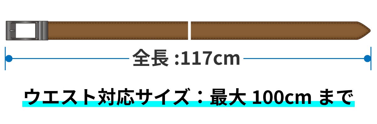 ベルトの長さを弊社通常サイズよりも10cm長く仕上げました。ウエスト対応サイズは最大100cmまで対応しているため、多くの方のウエストサイズをカバーできるようになっています。もちろん、長すぎる場合はベルトをカットしてご使用いただけます。