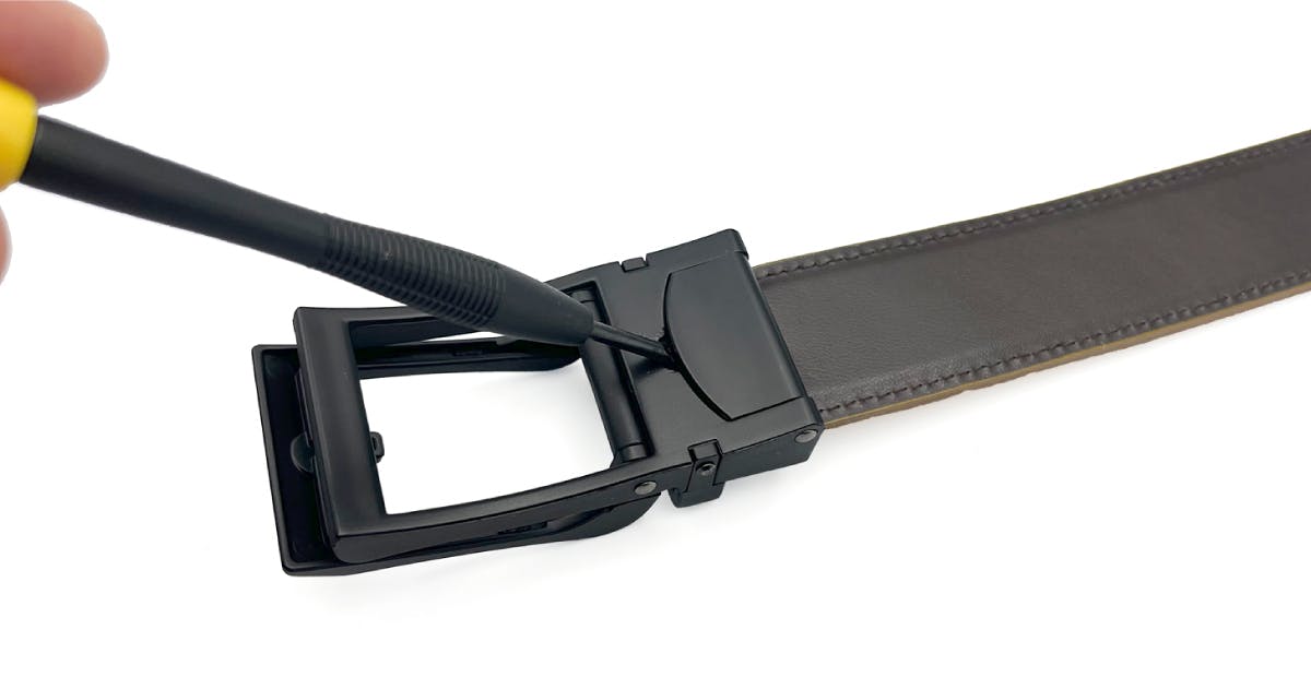 フタをあけるとベルトが外せます。お好みの長さをハサミなどで真っ直ぐにカットし、バックルに戻してフタを閉じるとカット終了です。