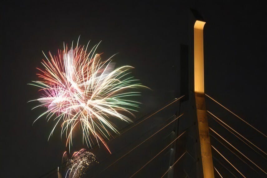 越谷の象徴的な橋「しらこばと橋」と花火