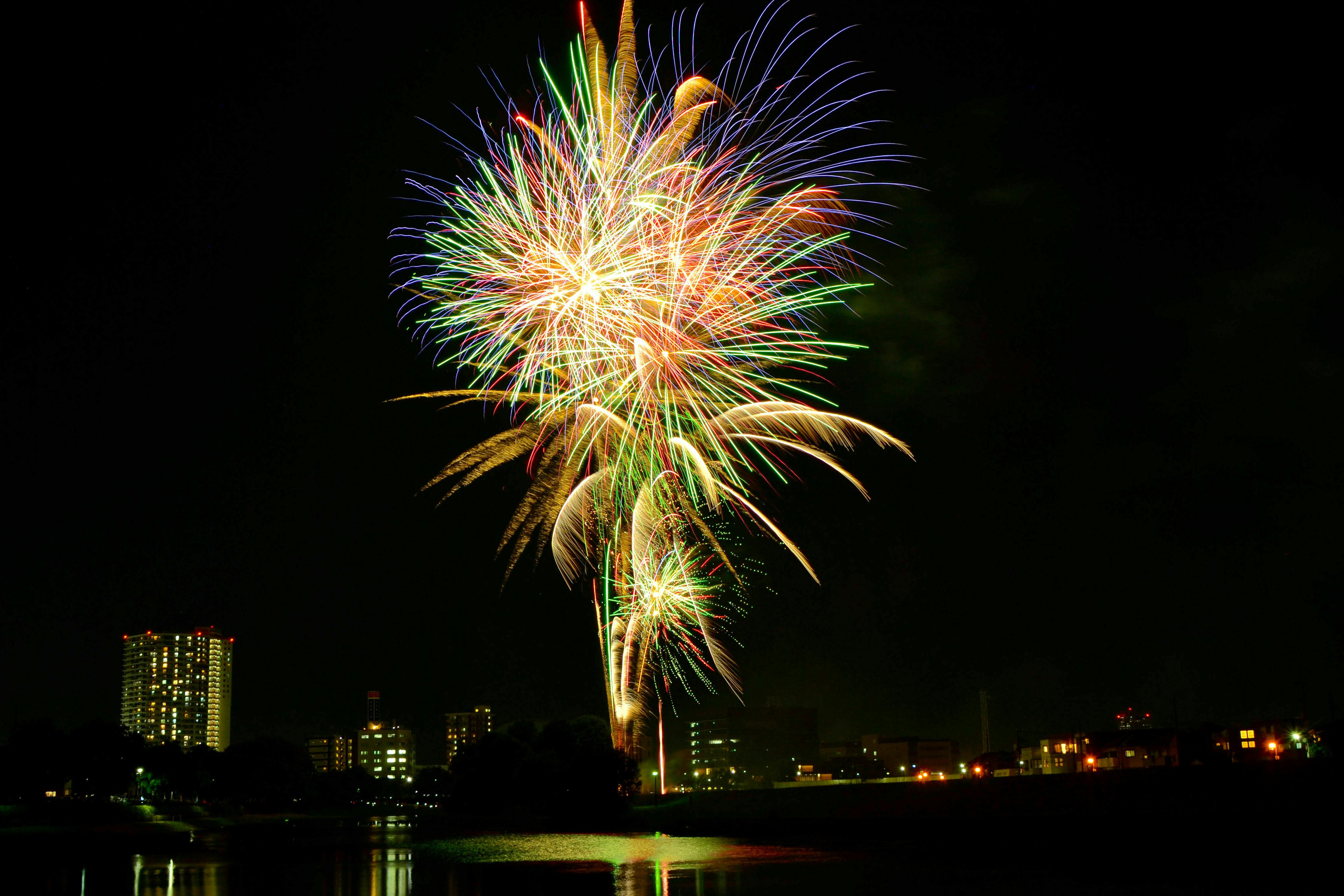 越谷花火大会の様子 涼しげな水辺で花火を打ち上げています