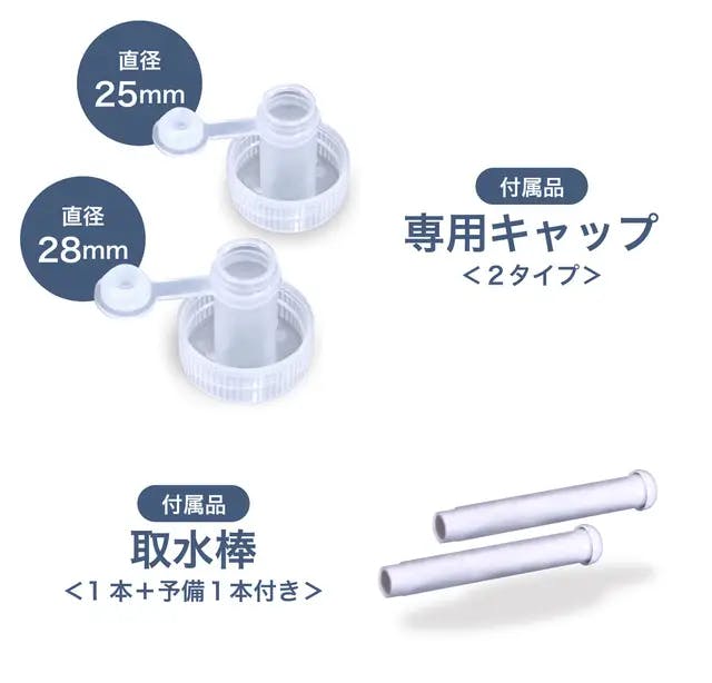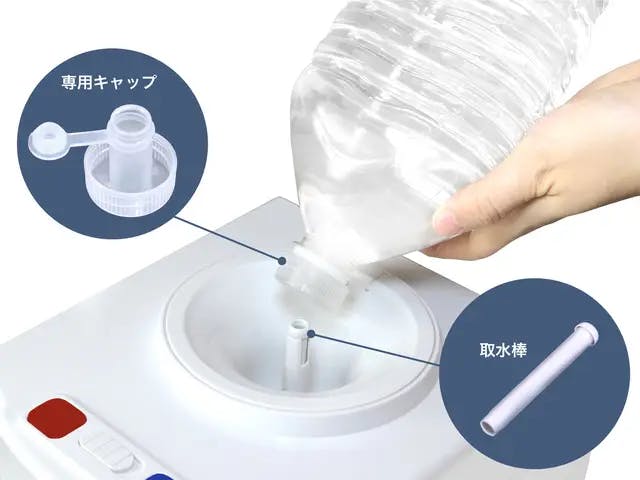 ペットボトルを本体にセットする際、水がこぼれない構造になっている専用キャップが付属しています。