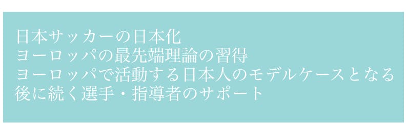 日本人にあった日本人のためのスタイルを世界の最前線で考え、将来的に日本のサッカーへ還元していく事で、日本サッカーの未来に貢献していく