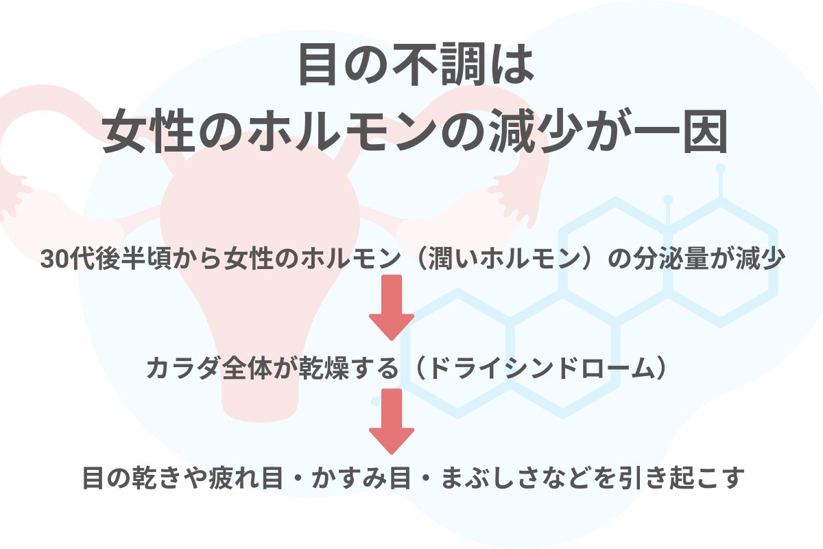 もちろん、目の不調は男性にもある悩みですが、女性はホルモンバランスの影響もあり、特に30代以降はより不調を感じやすいのだそうです。