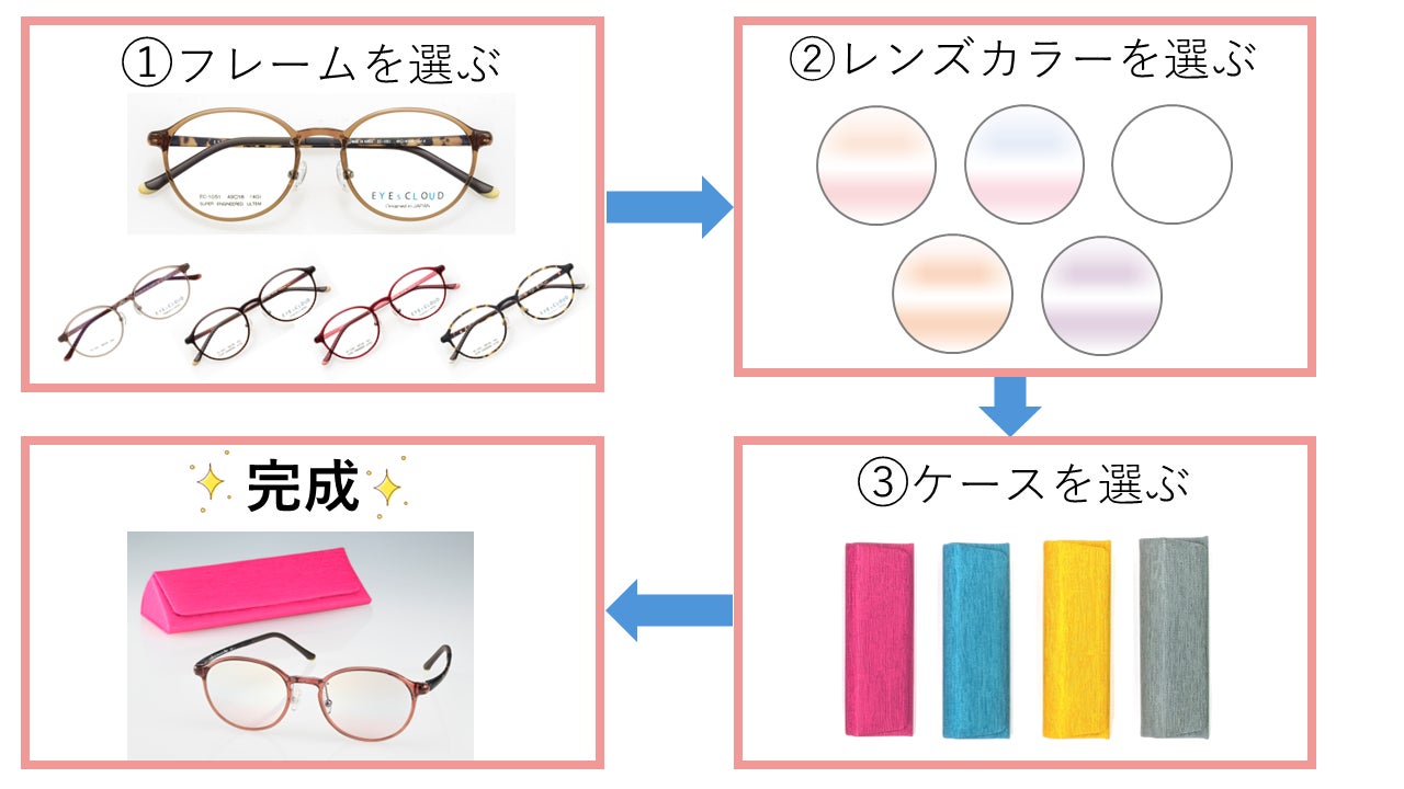 お好きなフレーム・レンズ・ケースを自由に組み合わせていただき(全100通り)あなただけのメガネを選んでいただけます。